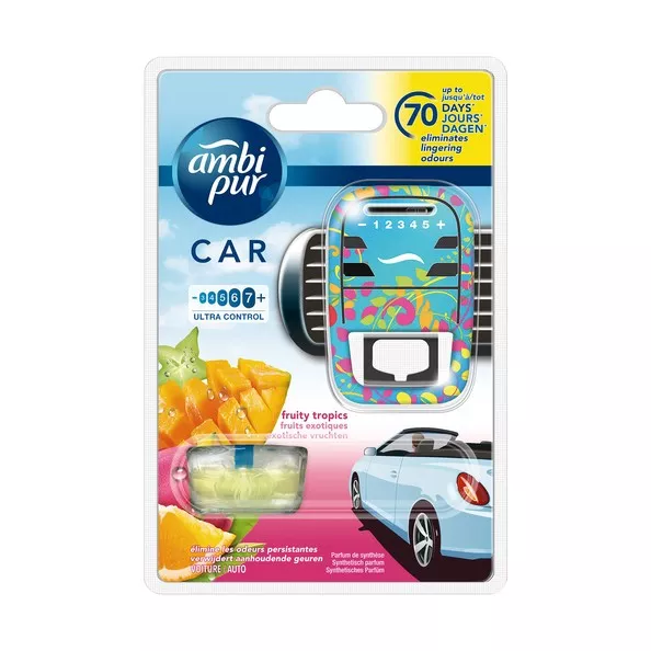 Geurverspreider en navulling. Bevestiging met clip op ventilatierooster. Fruity.