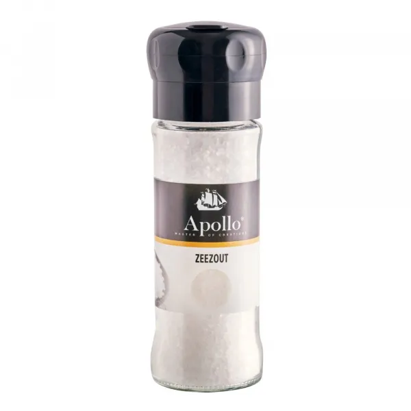 Apollo zeezout in molen is bereid van puur zout in grove korrels. Te gebruiken om diverse gerechten op smaak te brengen. Denk hierbij aan frites en vlees of een saus.
