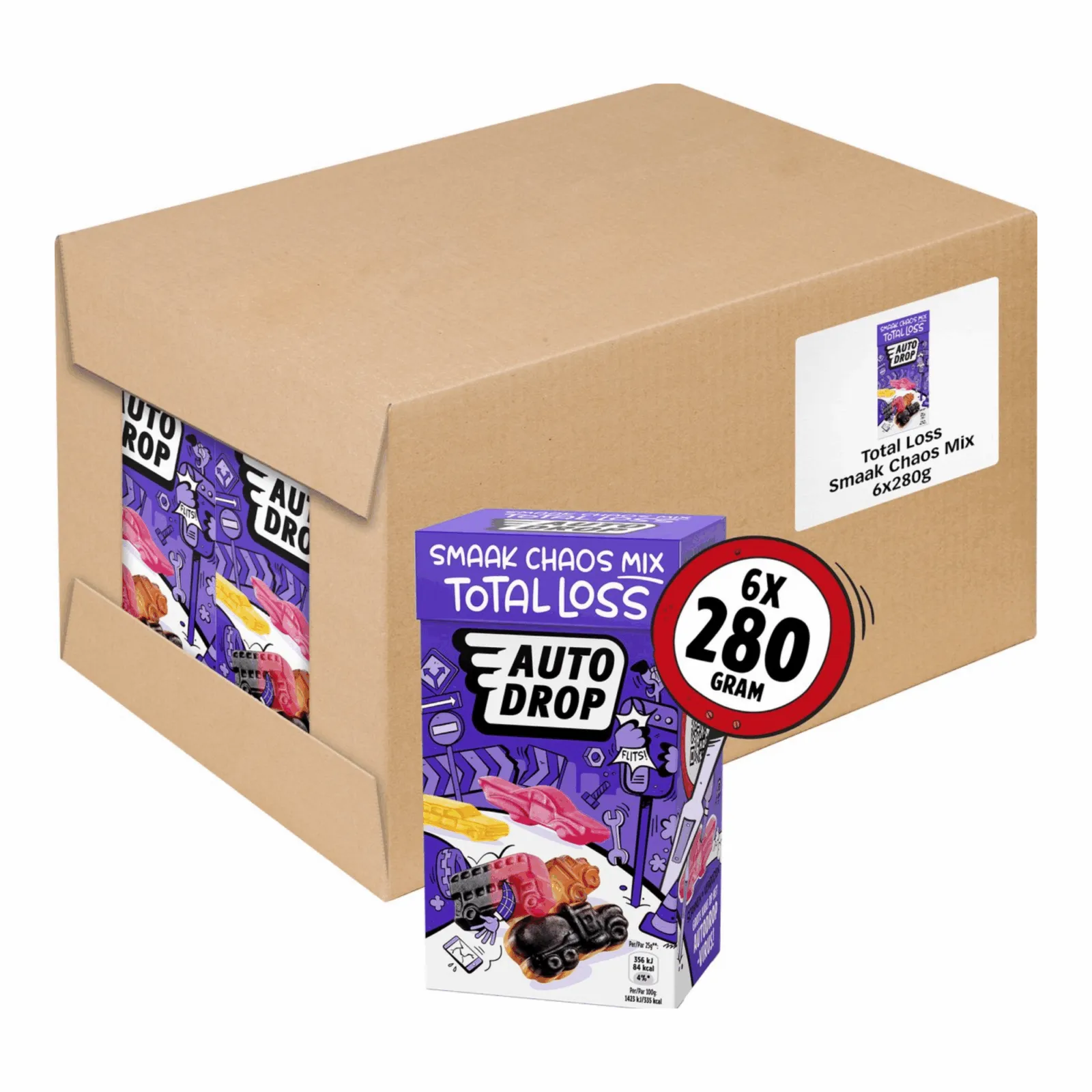 Wat een chaos op de weg! In de mixdoos van Autodrop total loss is het een wirwar van 11 verschillende smaken. Aan jou de taak om een beetje orde in het doosje te scheppen. Welke smaak eet jij als eerste op om de weg weer vrij te krijgen? Welk model je ook kiest, ze zijn allemaal gemaakt met natuurlijke smaak- en kleurstoffen en vrij van gluten! Autodrop mixdoos total loss wordt verkocht per doos met 6 doosjes van 280 gram. Dus wat ga je doen? Als de brandweer deze Autodrop total loss kopen bij online snoepgroothandel Compliment.nl!