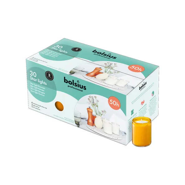 De Bolsius Professional Starlight kaars is een tijdloze kaars in glas. De kaars is veilig, schoon, geurloos en makkelijk in gebruik. Met een brandduur van maar liefst 50 uur is dit een favoriet voor professioneel gebruik. De grote vlam, die van het begin tot het eind goed zichtbaar is en steeds gemakkelijk opnieuw aan te steken, zorgt voor avonden vol sfeer.