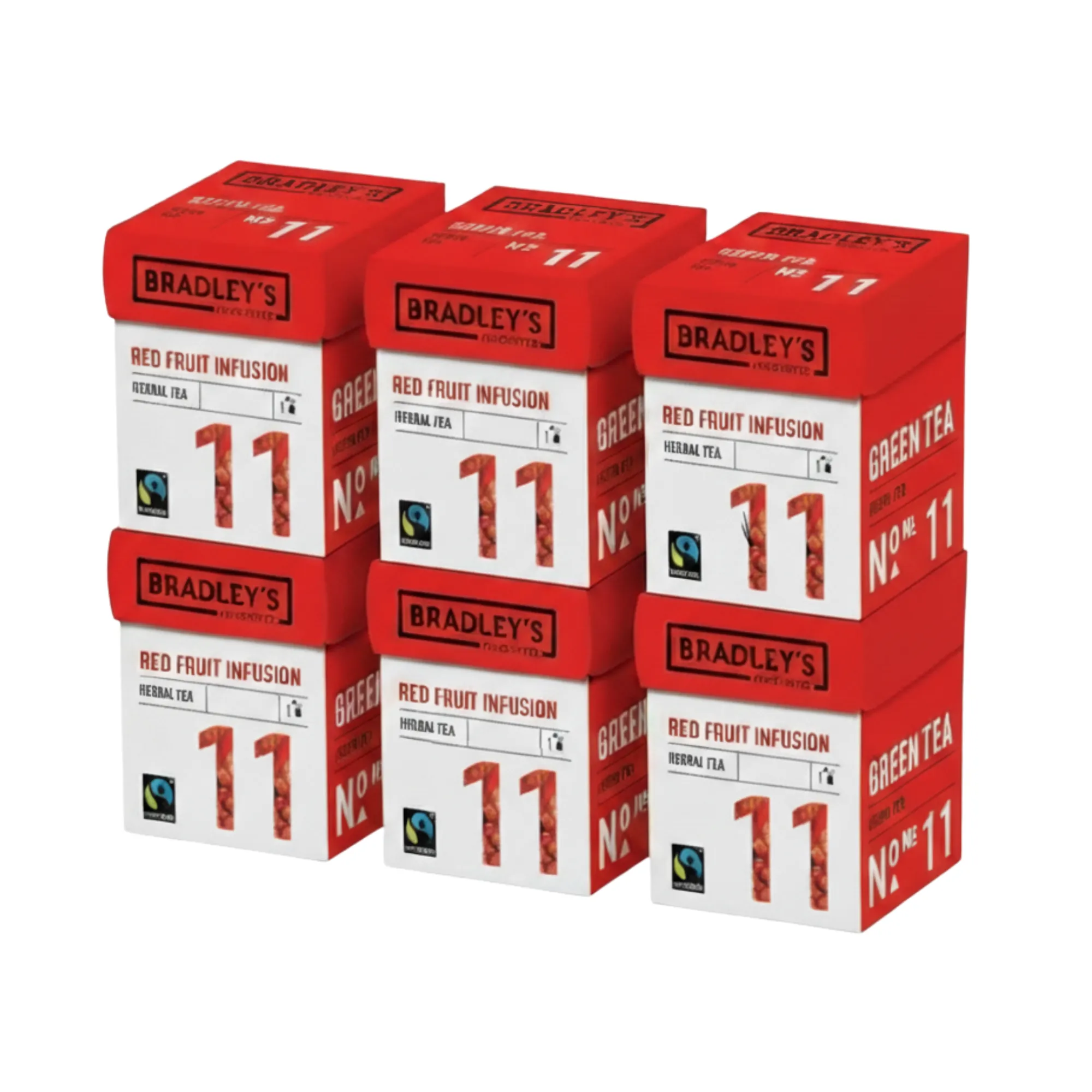 Bradley’s Favourites Red Fruit Infusion No. 11 (72×1,5 g) is een cafeïnevrije vruchteninfusie met een fruitige blend van rozenbottel, framboos en zwarte bes. De theezakjes zijn verpakt in heatseal enveloppen die zorgen voor optimaal smaakbehoud. Dankzij de natuurlijke ingrediënten en de herkenbare fruitige smaak is deze infusion geschikt voor elk moment van de dag, zowel thuis als in horeca-omgevingen. De compacte verpakking met 6x 12 losse sachets maakt het eenvoudig om de thee per kopje te gebruiken.