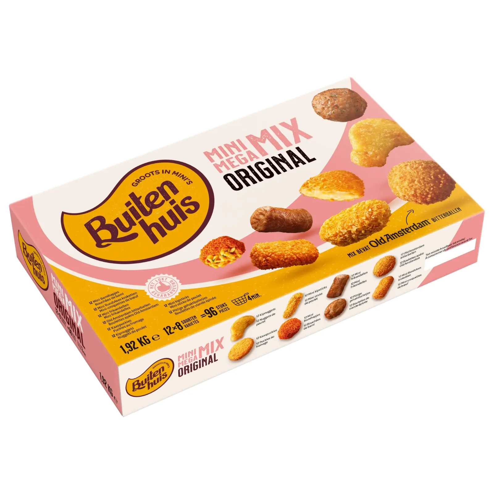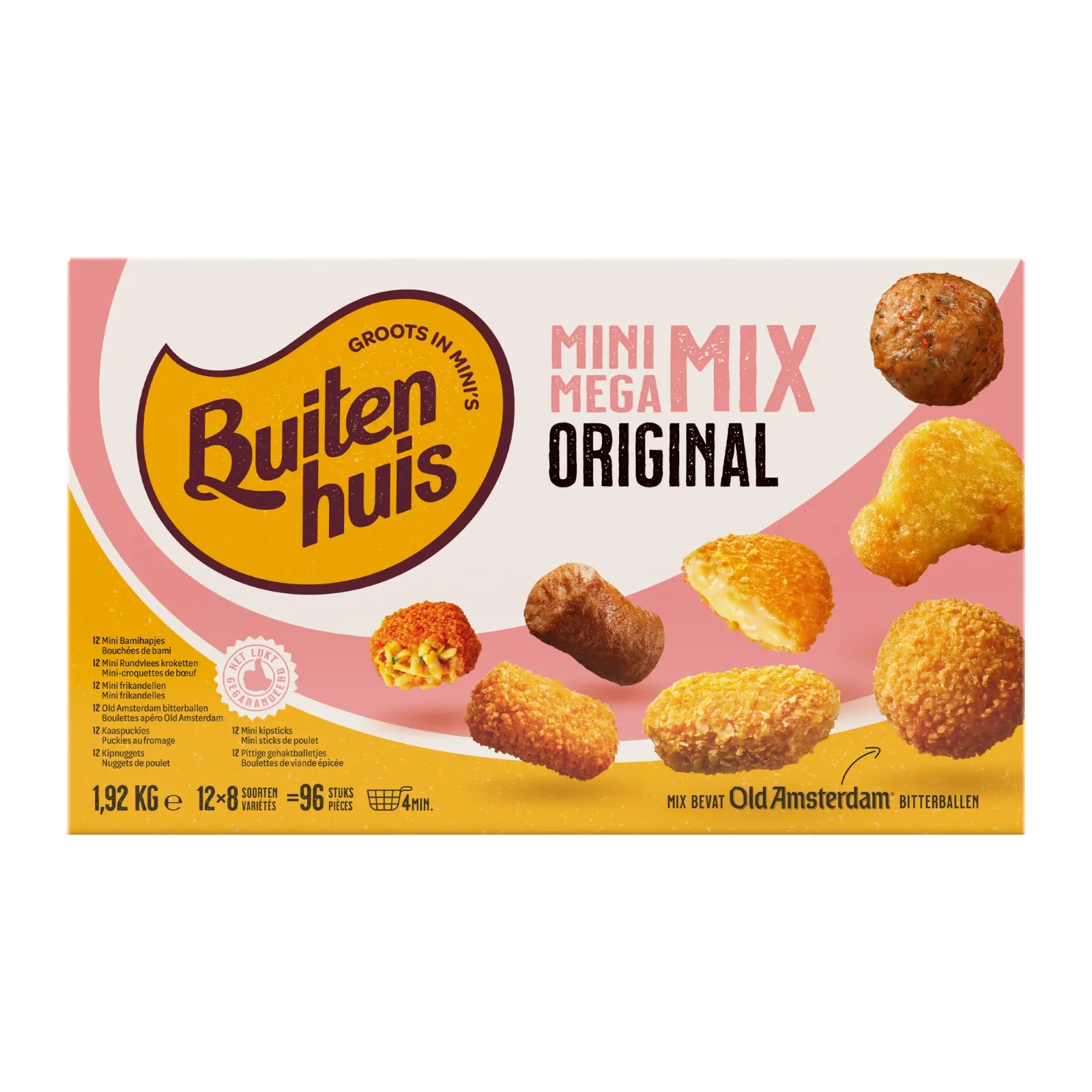 Kaaspuckie: 50% smeltkaas (44% kaas (gepasteuriseerde MELK, MELKzuur startcultuur, kleurstof (E160a), zout, microbieel stremsel), water, 16% Goudse kaas (gepasteuriseerde MELK, zout, MELKzuur startcultuur, microbieel stremsel, kleurstof (E160a)), boter (bevat MELK), zetmeel (mais), MELKeiwit, smeltzouten (E339, E452), gemodificeerd zetmeel (mais), bloem (mais), aroma, zout, kleurstoffen (E160a, E160c)), bloem (TARWE), water, raapzaadolie, zout, gist, kleurstof (E160c), specerijextracten, vezels (TARWE) Bamihapje: 46% gekookte mie (mie (TARWE), water), water, bloem (TARWE, SOJA), 7% groenten (prei, rode paprika, ui), zetmeel (TARWE), plantaardige oliën (palm, kokos, raapzaad, in wisselende verhouding), suiker, glucosestroop, gemodificeerd zetmeel (mais), zout, gistextract, stabilisatoren (E461, E412, E516, E415, E401, E450), knoflookpuree, sambal oelek (chilipeper, zout, zuurteregelaar (E260), conserveermiddel (E211)), kleurstoffen (E160b(ii), E160b(i), E150d, E150c, E160c), gist, gehydrolyseerd plantaardig eiwit (SOJA), natuurlijk aroma (TARWE), natuurazijn, MELKeiwit, specerijen, emulgator (E466), zuurteregelaar (E526), voedingszuur (E330), specerijextracten, gebakken uitjes (75% ui, palmolie, TARWEbloem, zout), SOJAsaus (water, SOJAbonen, TARWE, zout, alcohol, natuurazijn, suiker, conserveermiddel (E202)), gelatine (rund), kruiden. pittig gehaktballetje 47% kippenseparatorvlees, 11% rundvlees, groenten (ui, rode peper), paneermeel (bevat TARWE), water, kippencollageen, rundvet, kruiden en specerijen, zout, melado, stabilisatoren (E451, E450), gehydrolyseerd plantaardig eiwit (SOJA), kleurstof (E150c), SOJAbonen, salmiakzout, zetmeel (TARWE) Kipnugget: 35% kippenvlees, water, bloem (TARWE, maïs, rijst, ROGGE), 10% kippencollageen, raapzaadolie, zetmeel (aardappel, erwt, TARWE, mais), plantaardig eiwit (SOJA), kleurstof (E170), vezels (TARWE, erwt), zout, palmvet, stabilisatoren (E466, E452, E450), aroma, suiker, gist, MELKeiwit, TARWEGLUTEN, gehydrolyseerd plantaardig eiwit (raapzaad), weipermeaat (MELK), specerijen, verdikkingsmiddel (E425), heelEIpoeder (scharrel), dextrose, rijsmiddel (E500). Mini frikandel: 51% kippenseparatorvlees, 14% rundvlees, water, paneermeel (TARWEbloem, TARWEzemelen, water, gist, zout), kippencollageen, rundvet, ui, zout, kruiden en specerijen (koriander, gember, komijn, karwijzaad, foelie, fenegriek, peper, MOSTERDzaad, nootmuskaat, kurkuma, piment), plantaardig eiwit (SOJA), aroma (SOJA), stabilisatoren (E451, E450). Nasi hapje: 46% gekookte rijst (water, rijst), water, bloem (TARWE, SOJA), 7% groenten (prei, rode paprika, ui), gebakken uitjes (75% ui, palmolie, TARWEbloem, zout), SOJAsaus (water, SOJAbonen, TARWE, zout, alcohol, natuurazijn, suiker, conserveermiddel (E202)), zetmeel (TARWE), plantaardige oliën (palm, kokos, raapzaad, in wisselende verhouding), gelatine (rund), suiker, glucosestroop, gemodificeerd zetmeel (mais), zout, gistextract, stabilisatoren (E461, E412, E516, E415, E401, E450), sambal oelek (chilipeper, zout, zuurteregelaar (E260), conserveermiddel (E211)), gist, specerijen, gehydrolyseerd plantaardig eiwit (SOJA), specerijextracten, natuurlijk aroma (TARWE), kleurstoffen (E150d, E150c, E160c), natuurazijn, MELKeiwit, emulgator (E466), zuurteregelaar (E526), voedingszuur (E330), kruiden, knoflookpuree. Risotto mozzarella bal: 32% gekookte rijst (water, rijst), bloem (TARWE, rijst), 15% groenten (60% erwt, tomaat, ui), water, plantaardige oliën (raapzaad, palm, kokos, zonnebloem, olijf, citroen, in wisselende verhouding), 6% mozzarella (gepasteuriseerde MELK, zout, verdikkingsmiddel (E461), zuursel, microbieel stremsel, voedingszuur (E330)), zout, suiker, zetmeel (mais, TARWE), glucosestroop, specerijen, weipoeder (MELK), stabilisatoren (E461, E415, E401, E516, E412, E450), gemodificeerd zetmeel (mais, aardappel), kaaspoeder (MELK), knoflookpuree, dextrose, gist, gistextract, kruiden, aroma, boterpoeder (MELK), vezels (TARWE), specerijextracten, voedingszuren (E270, E327), citroensapconcentraat, natuurlijk aroma (TARWE), <2% tomatenpuree. Mini kipstick: 31% kippenvlees, water, cornflakes (mais, zout, suiker, GERSTemoutextract), 9% kippencollageen, bloem (TARWE), raapzaadolie, kleurstof (E170), plantaardig eiwit (SOJA), zetmeel (aardappel), vezels (TARWE), zout, palmvet, stabilisatoren (E466, E452, E450), aroma, MELKeiwit, gehydrolyseerd plantaardig eiwit (raapzaad), weipermeaat (MELK), verdikkingsmiddel (E425), gist, E = door de EU goedgekeurde hulpstof