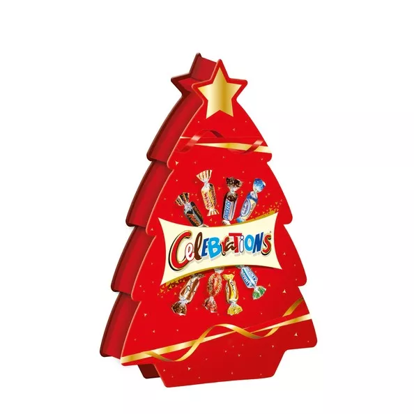 Celebrations: een verrassende mix van bekende chocolademerken, verpakt in een kerstboom, waarbij ieders favoriete chocolaatje er tussen zit.