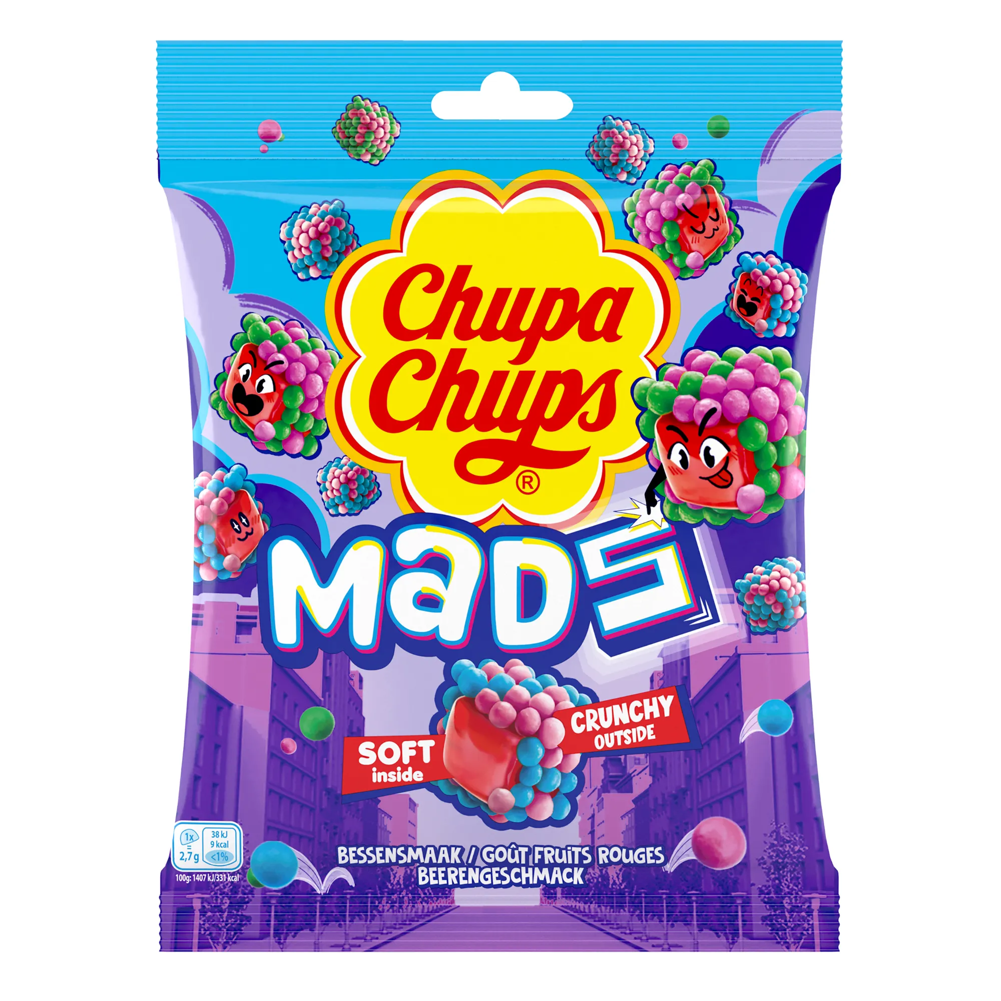 Chupa Chups Mads Bessen uitdeelzakje (12×115 gram) is een kleurrijke snoepmix met zachte, fruitige gummies in verschillende bessensmaken. Deze bekende Mads-snoepjes hebben speelse vormen en een frisse, zoete smaakbeleving die vooral bij kinderen populair is. De verpakking bevat 12 zakjes van 115 gram, ideaal als uitdeelzakje, traktatie of als kleurrijke aanvulling op het snoepschap. Dankzij de herkenbare Chupa Chups-uitstraling is dit product aantrekkelijk voor impulsverkoop en feestelijke momenten.