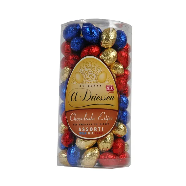 Lekkere chocolade eitjes van Driessen in de smaken puur, melk en wit. Er zit 1 kg in een doos.