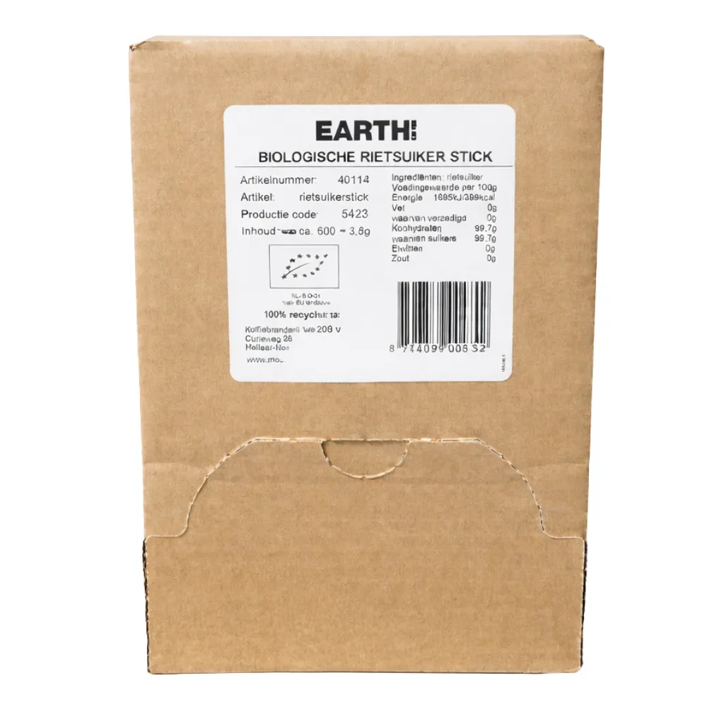 De Earth BIO Rietsuikersticks zijn biologische, Fairtrade gecertificeerde sticks met puur rietsuiker—een natuurzuivere en verantwoorde keuze voor het zoeten van warme dranken. Elke stick is individueel verpakt voor hygiënisch gebruik. Dankzij hun natuurlijke oorsprong en krachtige smaak zijn ze perfect voor kantines, cafés of thuisgebruik.
