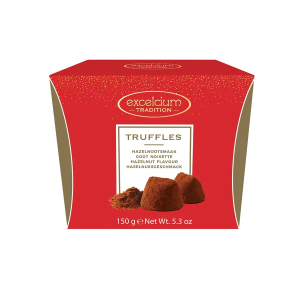 Wij verkopen de Excelcium truffels hazelnoot rood 150gr. a24 per 24.
