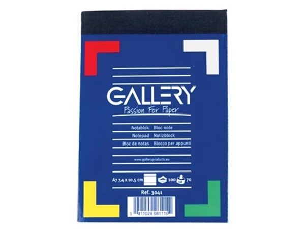 NOTABLOK A7 70G 100V GELIJND*Gallery notitieblok. ft A7. gelijnd. blok van 100 vel*Houtvrij papier van 70 g/m². Blok van 200 bladzijden (100 vel). Kopgeniet. Met microperforatie.*ft 7.4 x 10.5 cm (A7). gelijnd