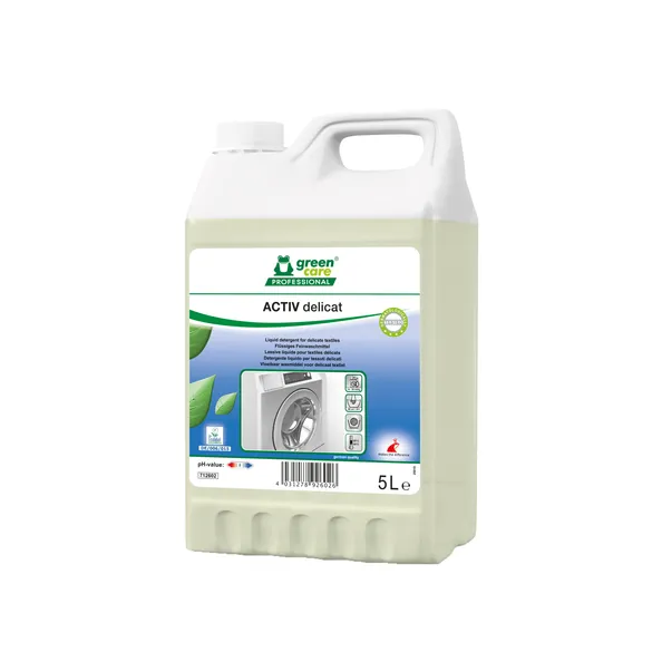 Duurzaam vloeibaar wasmiddel voor delicaat textiel. Beschermt delicaat textiel. Op basis van tarweproteine. Duurzaam. Vloebaar wasmiddel op basis van tarweproteine voor delicate vezels ( wol, zijde, viscose, synthetische en elastische vezels). Reinigt zacht, beschermt fijn en delicaat textiel en vermijdt dat wol pluist tijdens het wassen. Voor wastemperaturen van 30 tot 60 graden. Dermatologisch getest. Geconcentreerde formule. 5 liter is 100 wasbeurten (machine van 5 kg met 2.5 kg droog linnen) Duurzaam: op basis van afbreekbare en hernieuwbare plantaardige bronnen.