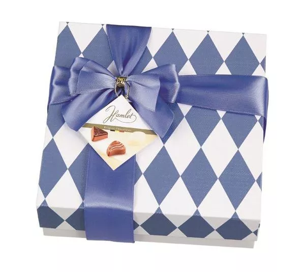 Een keuze verfijnde pralines, met verrukkelijke vullingen, in een grafisch jasje. Feestelijk afgewerkt met een satijnen strik.