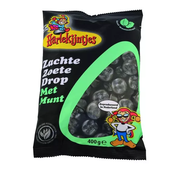 Wij verkopen de Harlekijntjes zachte drop met munt zak 400 gr per 12.