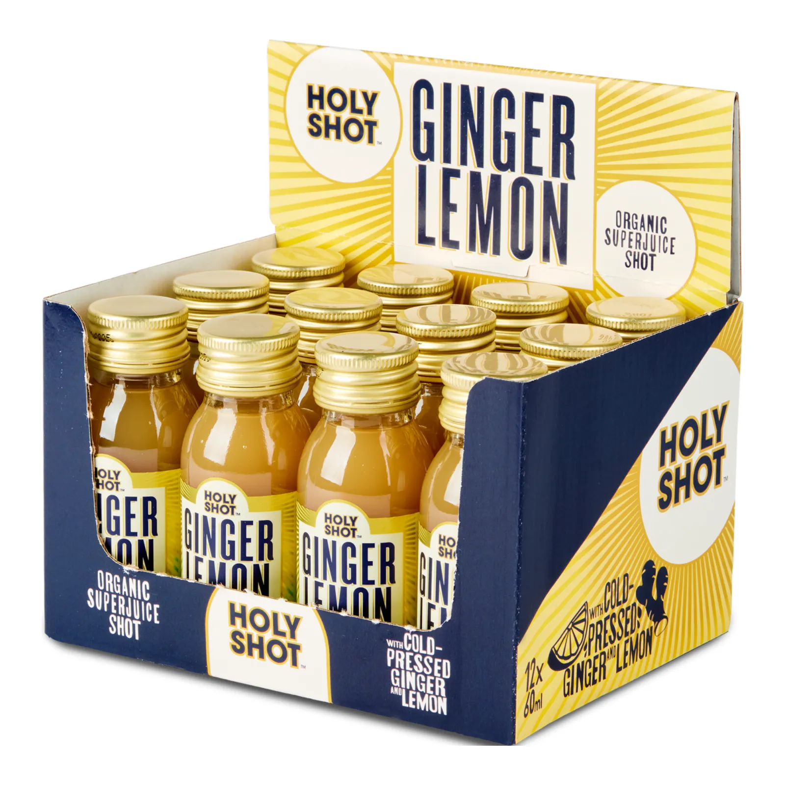 Bij Compliment.nl koop je voordelig Holyshot Ginger & Lemon BIO 12x 60ml, een biologische shot met een frisse en pittige smaak van gember en citroen voor een natuurlijke dagelijkse boost. Deze functionele shot is ontwikkeld voor iedereen die houdt van pure ingrediënten en een uitgesproken frisse smaak. De krachtige warmte van gember wordt perfect gecombineerd met het frisse en licht zure karakter van citroen, waardoor de shot intens maar prettig doordinkbaar is. Ideaal om je dag fris te starten of als oppepper tussendoor. Holyshot werkt uitsluitend met biologische ingrediënten en vermijdt onnodige toevoegingen. Dankzij het compacte formaat van 60 ml neem je deze shot eenvoudig mee naar werk, sport of onderweg. Deze shot past perfect binnen een bewuste en actieve levensstijl. Geschikt voor dagelijks gebruik of als korte kuur. De verpakking van 12 flesjes is handig voor voorraad of gedeeld gebruik. Een frisse en krachtige shot voor liefhebbers van natuurlijke smaken.