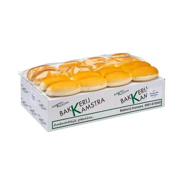 Witte horecapuntjes van Kamstra. Deze broodjes zijn al gesneden. De Lengte van een puntbroodje is 12 cm. Er zitten 32 broodjes in een doos.