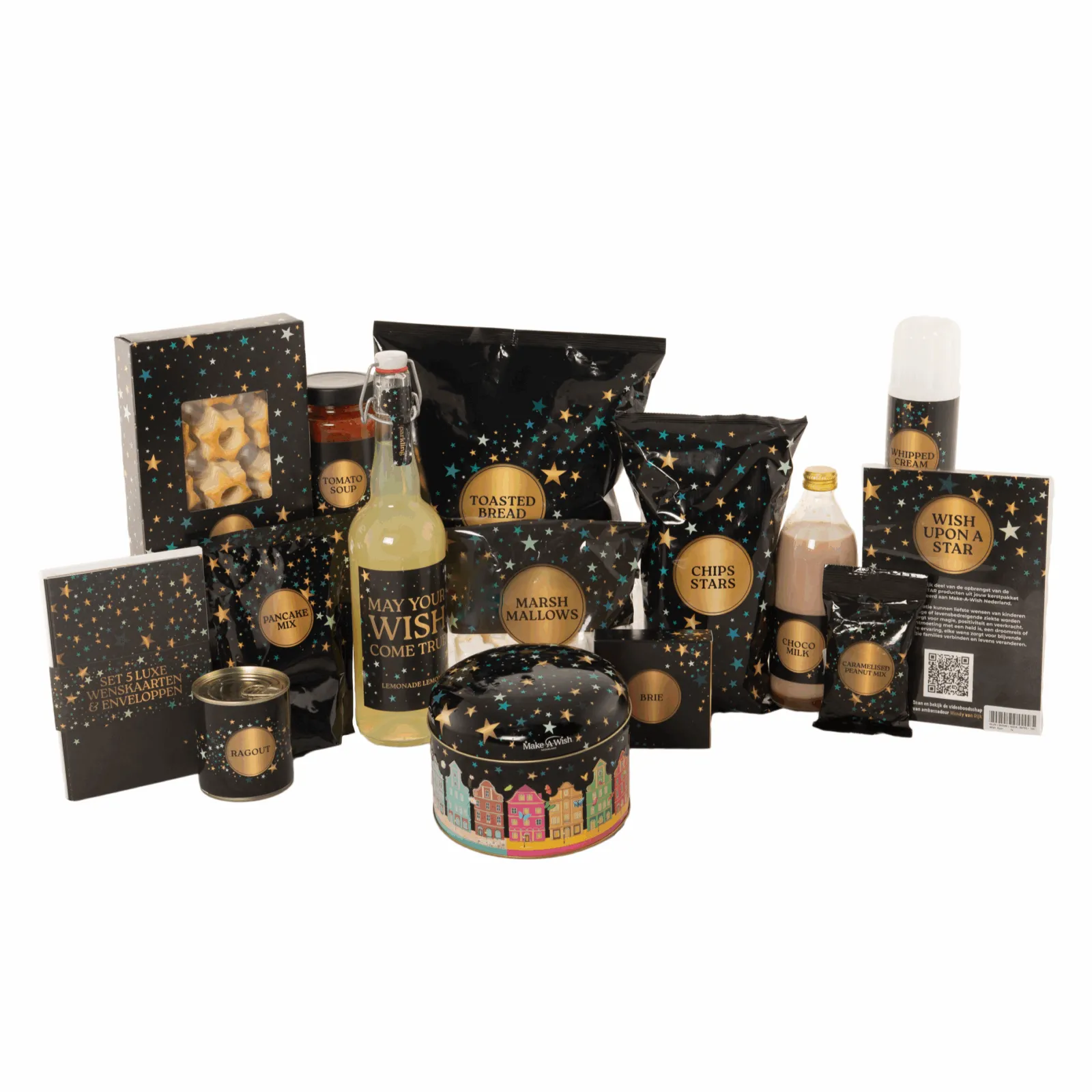 Bij Compliment.nl koop je voordelig het Kerstpakket Make-A-Wish, een betekenisvol en feestelijk cadeau dat niet alleen gevuld is met lekkernijen, maar ook een glimlach brengt bij kinderen die dat het hardst nodig hebben. Dit bijzondere kerstpakket is uitgevoerd in een stijlvolle sterrenhemelverpakking die warmte, hoop en verbondenheid uitstraalt. Binnenin vind je een luxe mix van hartige en zoete lekkernijen, zoals chips, toast, marshmallows, cranberry cookies, brie en tomatensoep, aangevuld met feestelijke drankjes zoals chocolademelk en verfrissende limonade. Extra bijzonder: onder de verpakking van de cranberry cookies zit een persoonlijke wens van een ernstig ziek kind, wat dit kerstpakket een extra emotionele en waardevolle betekenis geeft. Een deel van de opbrengst gaat naar Make-A-Wish Nederland, zodat dromen van kinderen met een ernstige of levensbedreigende ziekte werkelijkheid kunnen worden. Zo geef je met dit kerstpakket niet alleen iets lekkers en moois, maar draag je ook bij aan onvergetelijke herinneringen en een toekomst vol hoop voor anderen. Het Kerstpakket Make-A-Wish is dus veel meer dan een geschenk, het is een boodschap van liefde, solidariteit en betekenis.