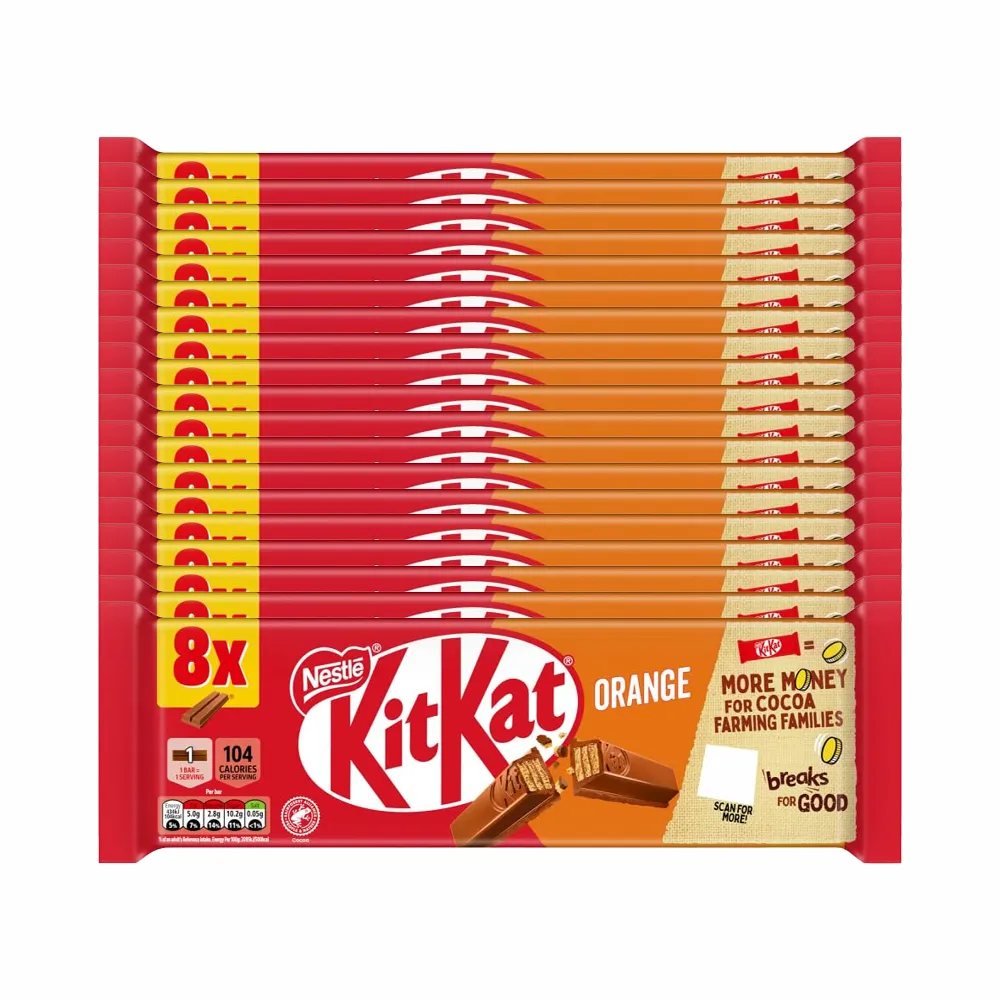 Bij Compliment.nl koop je voordelig KitKat 2F Orange 8 pack, een heerlijke klassieker waarbij knapperige wafers worden gecombineerd met romige melkchocolade en een frisse sinaasappeltwist. Elke reep bestaat uit twee luchtige wafelfingers omhuld met zachte sinaasappelmelkchocolade wat zorgt voor de perfecte balans tussen crunch en citrusachtige zoetheid. Deze KitKat Orange is ideaal als tussendoortje bij de koffie, voor onderweg, in de lunchbox of om te delen op kantoor. Dankzij de handige multipack met 8 individueel verpakte repen heb je altijd een verantwoorde portie bij de hand. KitKat staat bekend om zijn constante kwaliteit en gebruikt cacao uit verantwoorde teelt zonder kunstmatige kleurstoffen, smaakstoffen of conserveermiddelen. Een vertrouwde snack met een frisse twist voor iedereen die even wil genieten van een break met smaak.