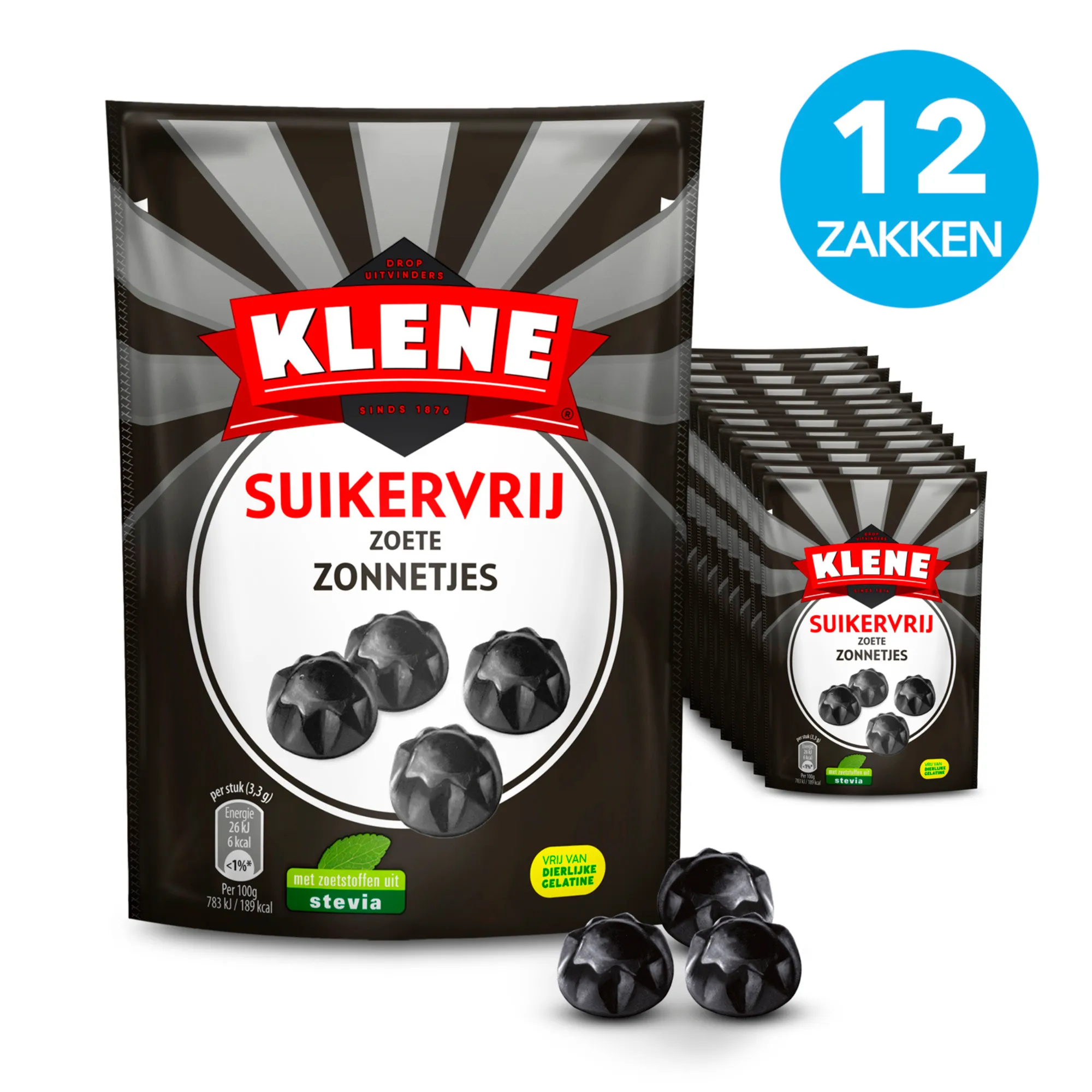 Klene suikervrije zoete zonnetjes zijn volzoete dropjes in de vorm van een zonnetje. Deze suikervrije dropjes van Klene worden gemaakt volgens authentiek familierecept. Gemaakt zonder dierlijke gelatine en suiker. De stevige dropjes zitten in een handig hersluitbaar zakje. Ideaal dus om mee te nemen onderweg in de auto, op kantoor of gewoon thuis in de snoepkast. De zakjes Klene drop zijn ook heel goed te gebruiken voor de verkoop in jouw kantine, snoepautomaat of vendingmachine. Voordelig zoete Klene dropjes kopen doe je natuurlijk bij online snoepgroothandel Compliment.nl. Je koopt Klene suikervrije zoete zonnetjes per doos met 12 zakjes van 110 gram (+/- 33 dropjes per zakje).