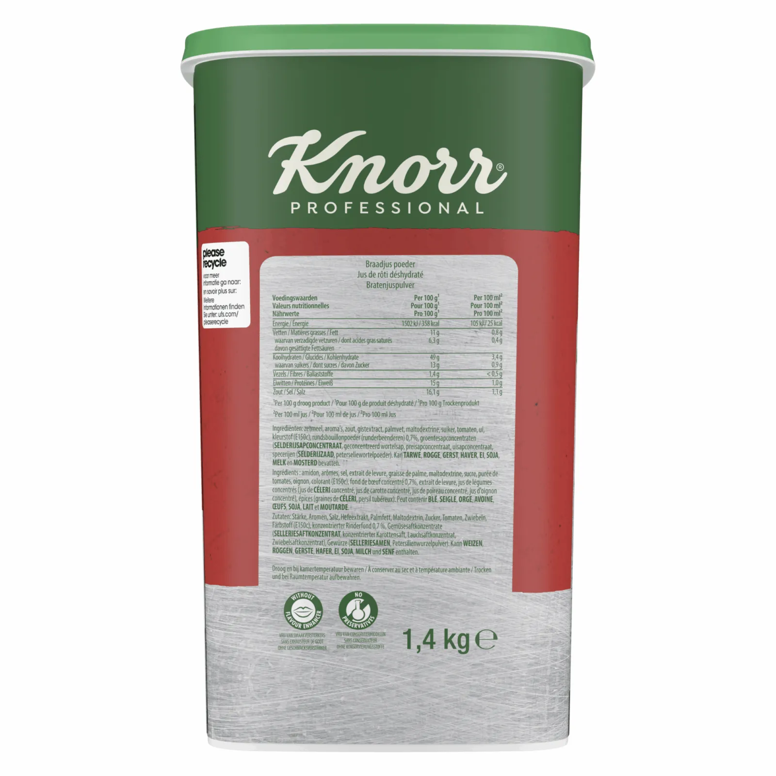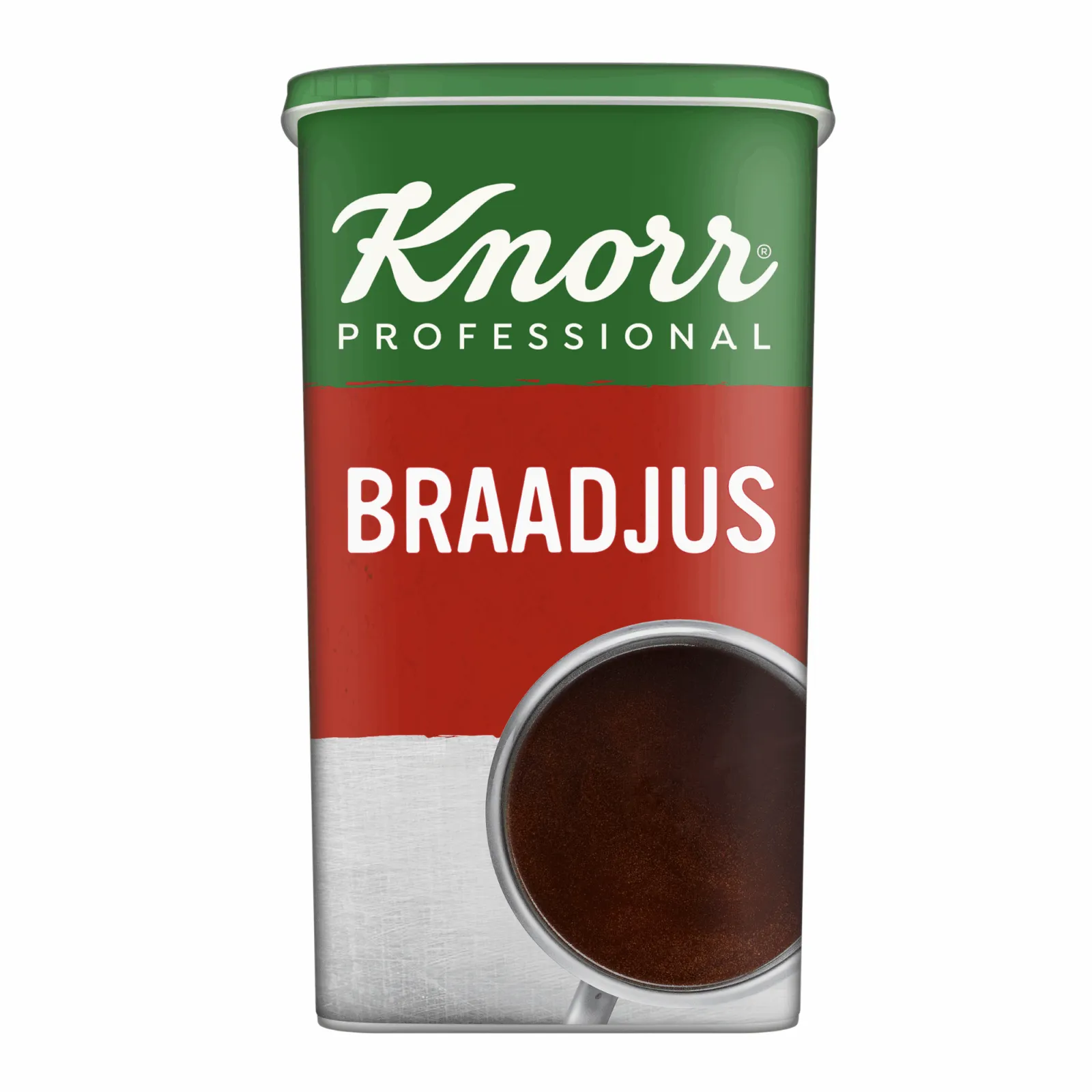 Knorr braadjus is een klassieke jus met een intense smaak van geroosterd vlees zonder toegevoegde kunstmatige geur-, kleur- en smaakversterkers. Met 1 bus kan 20 liter braadjus gemaakt worden. Er zit 1.4 kg in een bus.