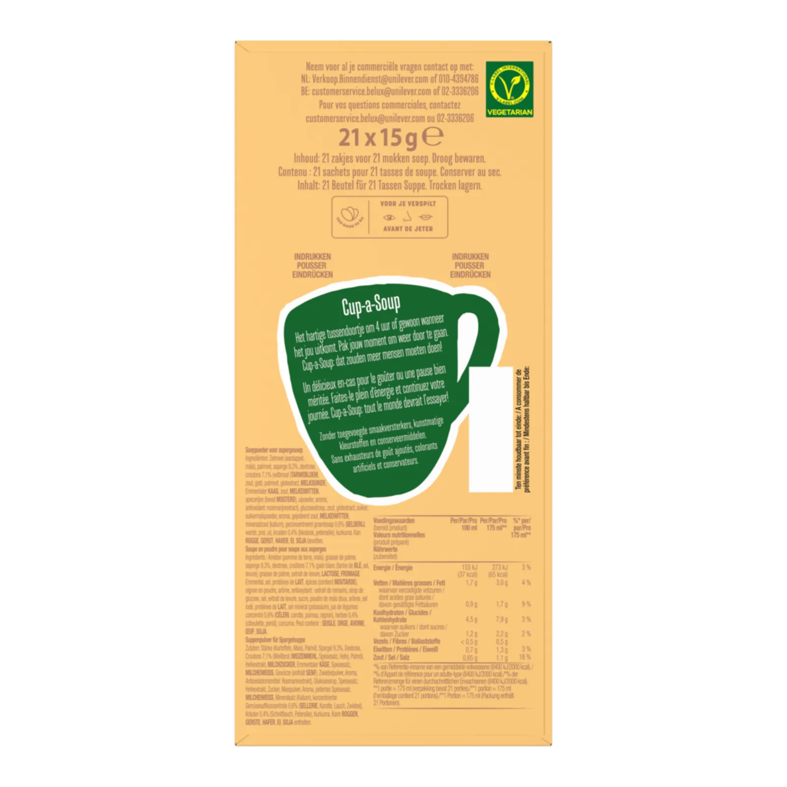 Bij Compliment.nl koop je voordelig Knorr Cup-a-Soup Asperge in een verpakking met 21 zakjes zodat je snel een warme mok soep klaar hebt bij een drukke dag of als je even pauze hebt. Deze romige aspergesoep geeft je meteen een hartige, zachte smaak van asperge met knapperige croutons en subtiele kruiden wat hem ideaal maakt voor lunch of tussendoor. De soep bevat geen kunstmatige kleurstoffen conserveermiddelen of toegevoegde smaakversterkers en is bovendien geschikt voor vegetariërs.