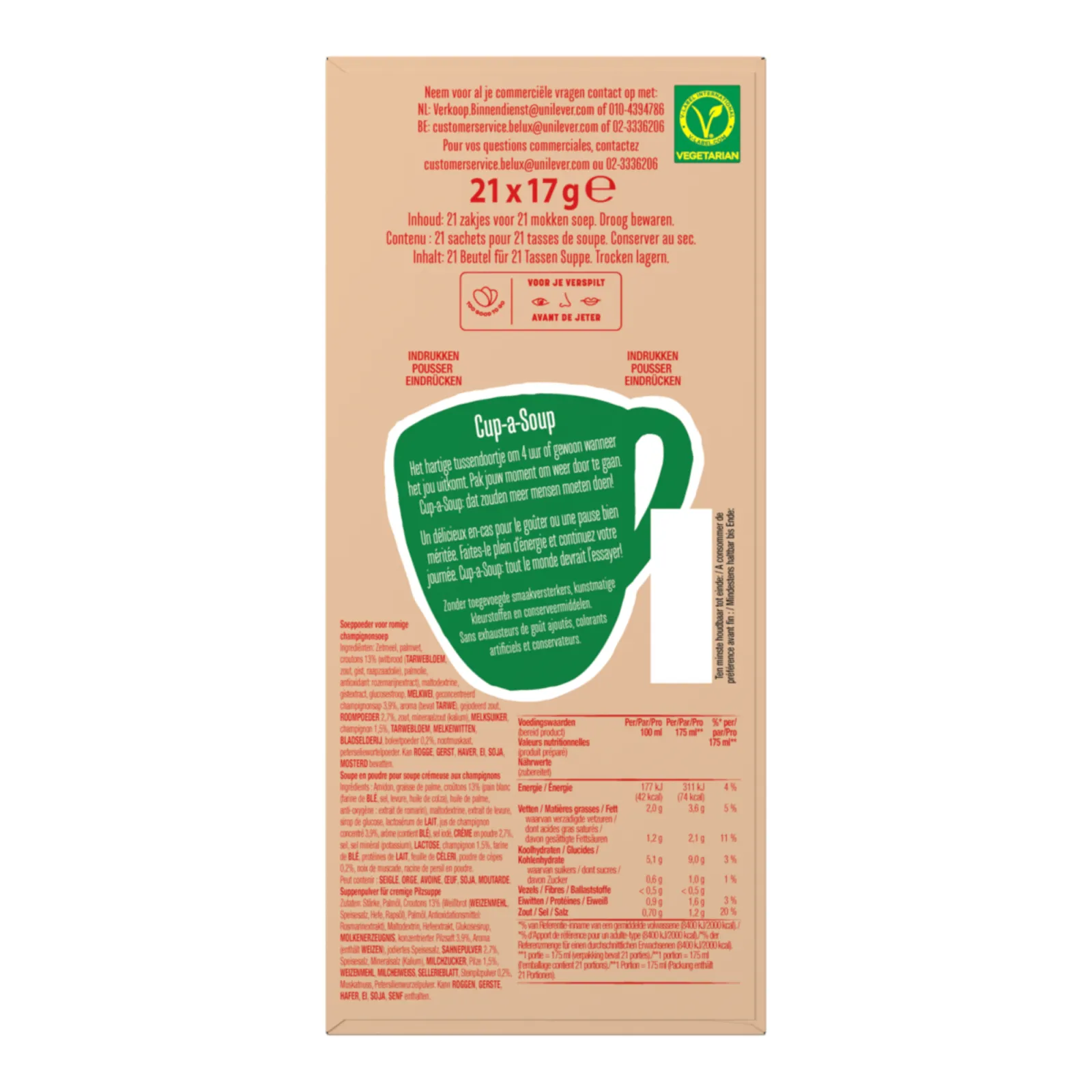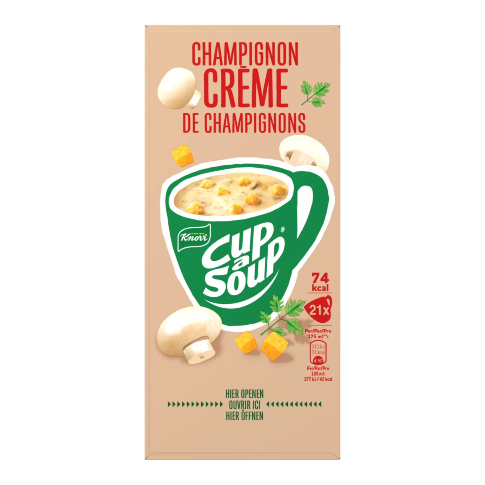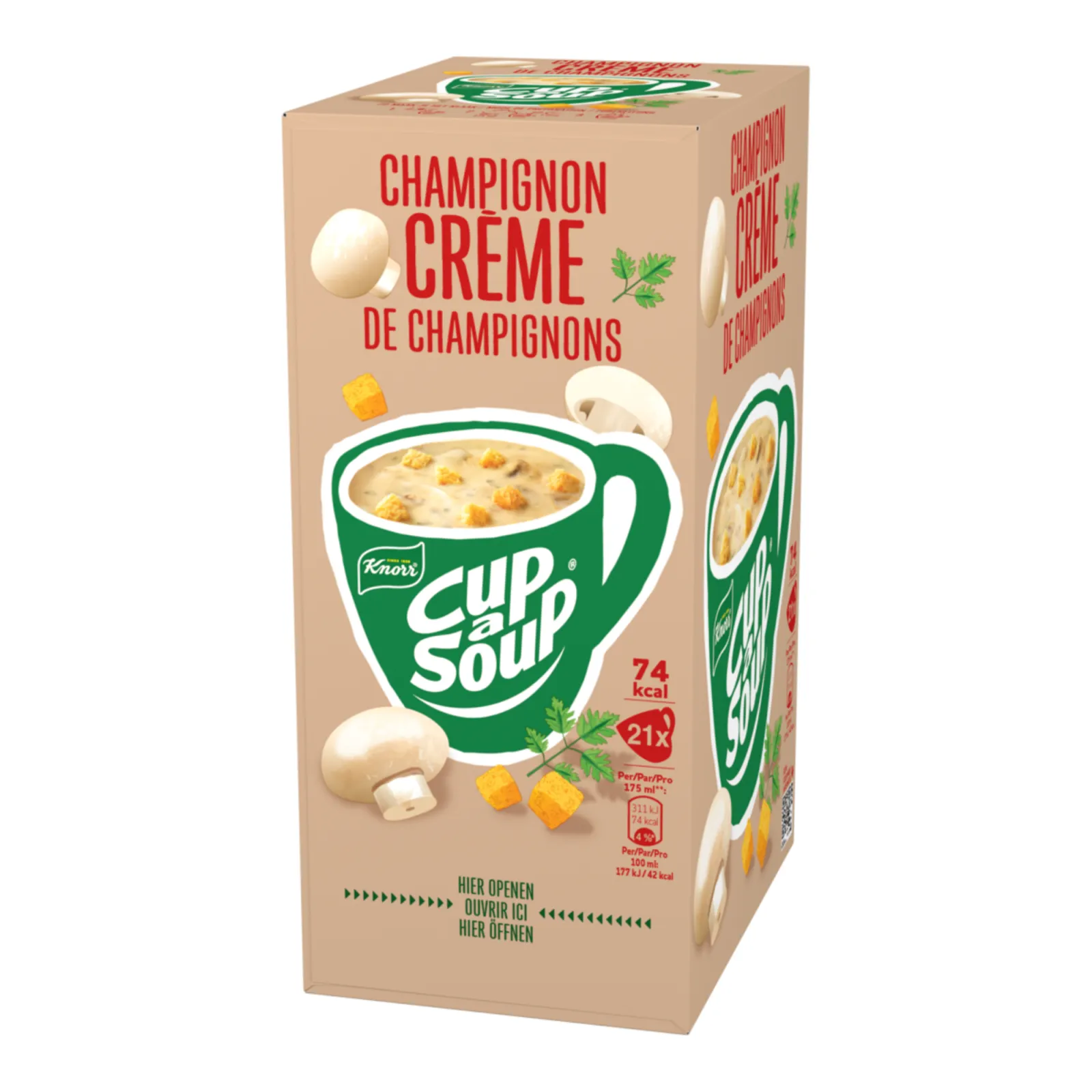 Knorr Cup-a-Soup Champignon Crème is dé snelle opkikker voor elk moment van de dag. Deze romige champignonsoep zit boordevol smaak en is binnen een minuut klaar. Ideaal voor op kantoor, in de kantine of gewoon thuis wanneer je zin hebt in iets warms. De zachte, volle champignonsmaak in combinatie met knapperige croutons zorgt voor een vertrouwd en hartig tussendoortje. Dankzij de handige portiezakjes heb je altijd precies genoeg en geen gedoe. Met 21 zakjes in één doos zit je voorlopig goed.