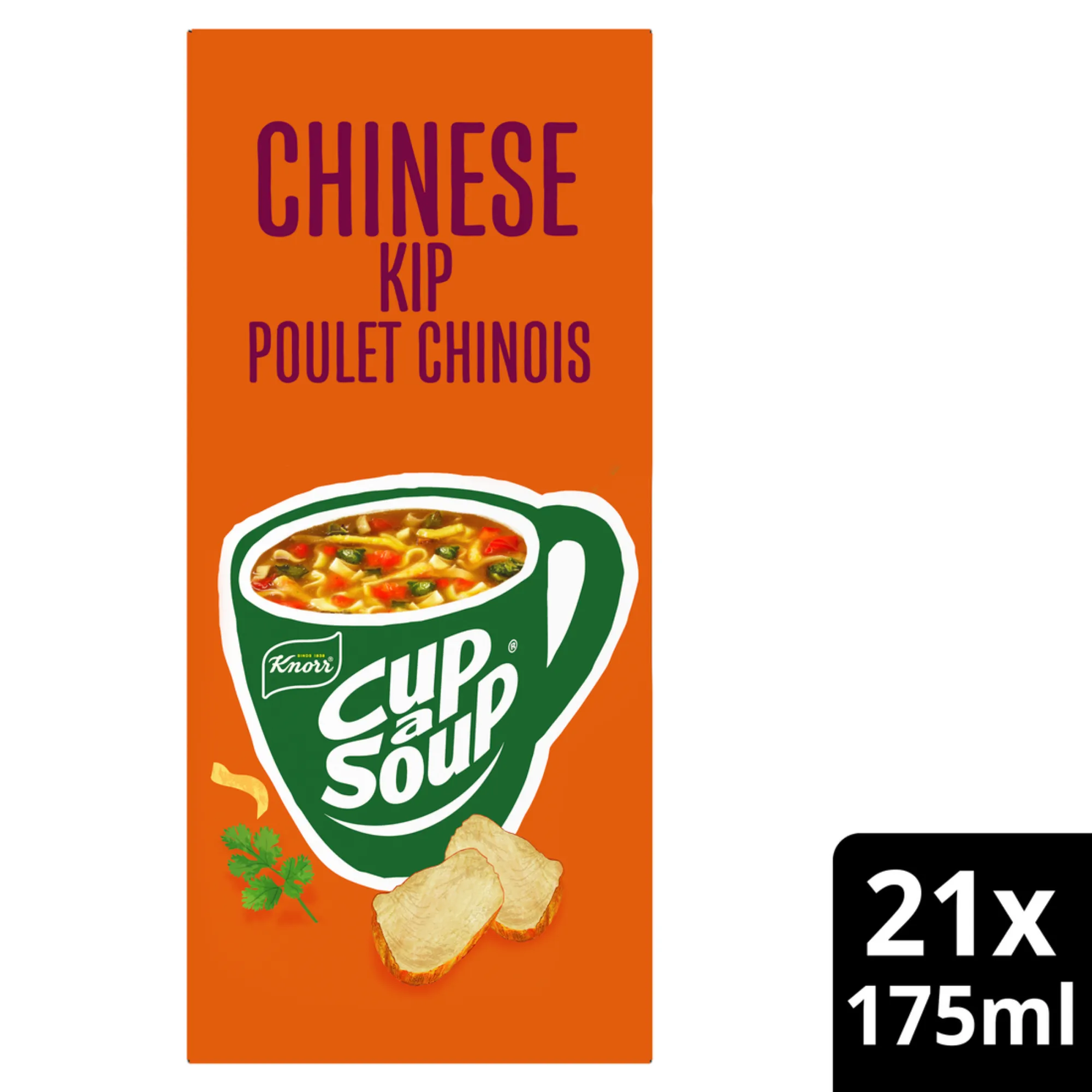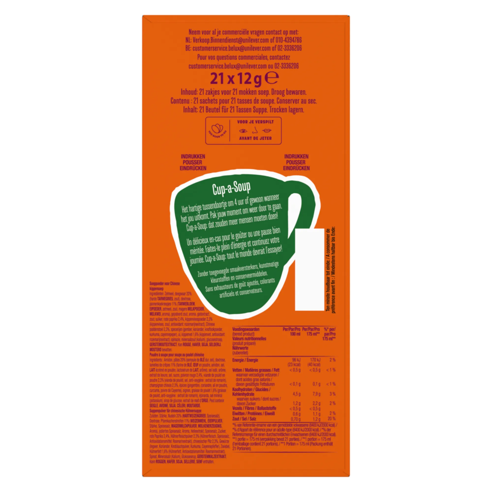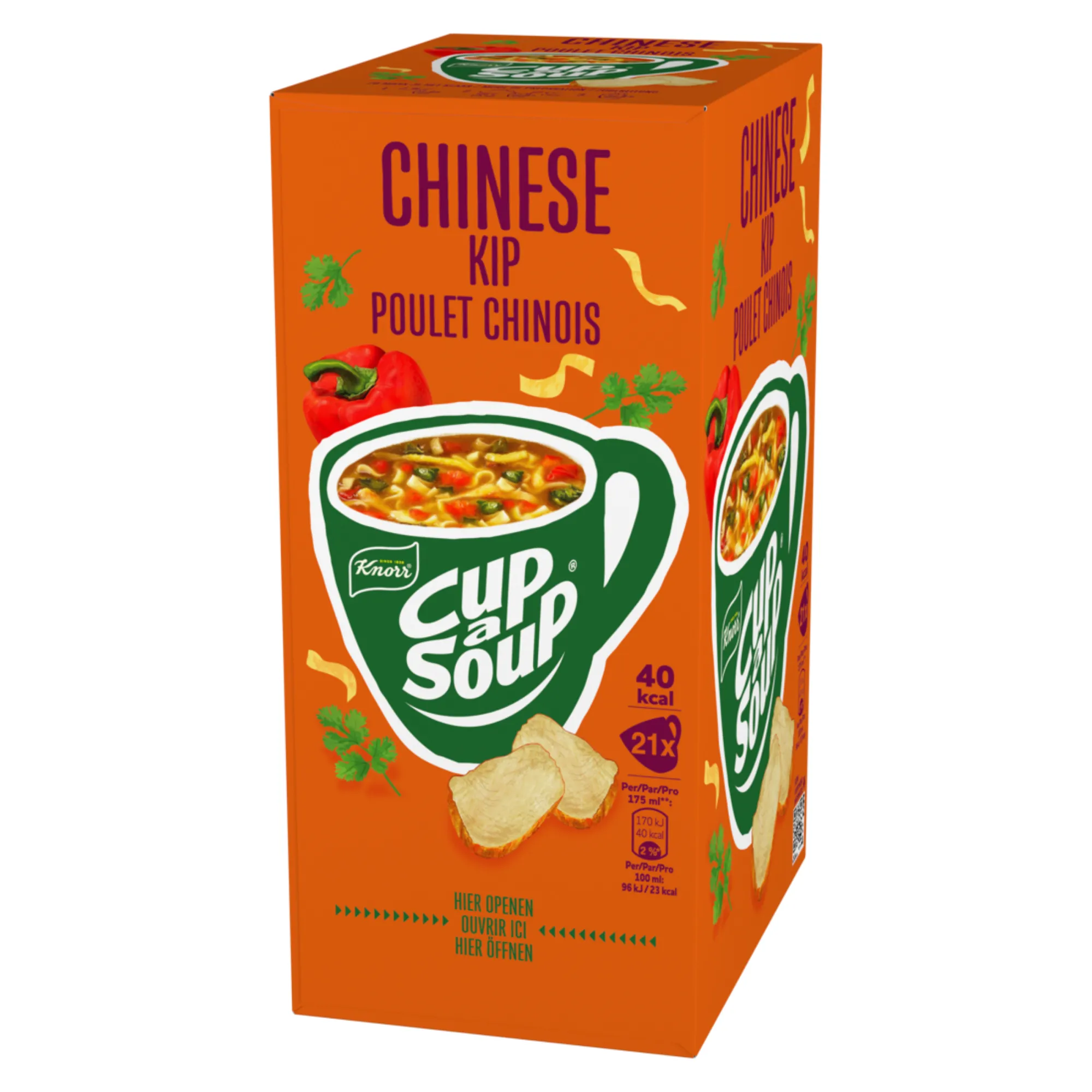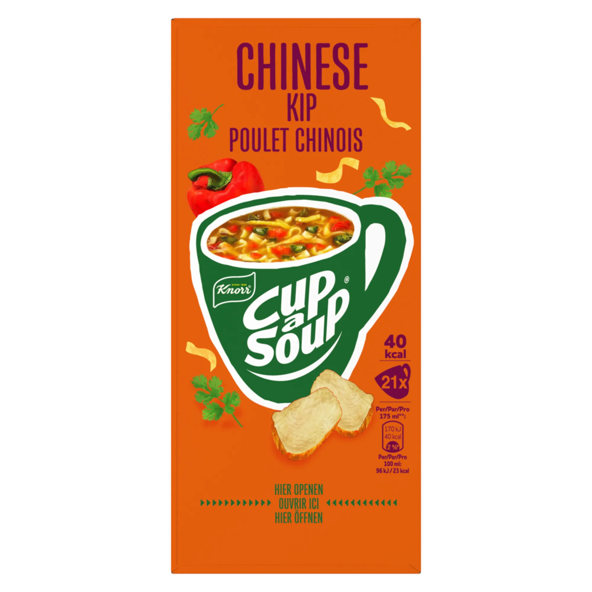 Knorr Cup-a-Soup Chinese Kip is een hartige instant soep met een kruidige Aziatische twist. Deze moksoep combineert de smaak van kip met specerijen zoals gember en koriander en bevat paddenstoel en kleine pannenkoekreepjes voor extra structuur. Ideaal als warm tussendoortje op kantoor, in de kantine of thuis. De doos bevat 21 portiezakjes; voeg eenvoudig kokend water toe en roer even door voor een snelle, smaakvolle soep. Met ongeveer 40 kcal per mok is het een lichte snack voor elk moment van de dag.