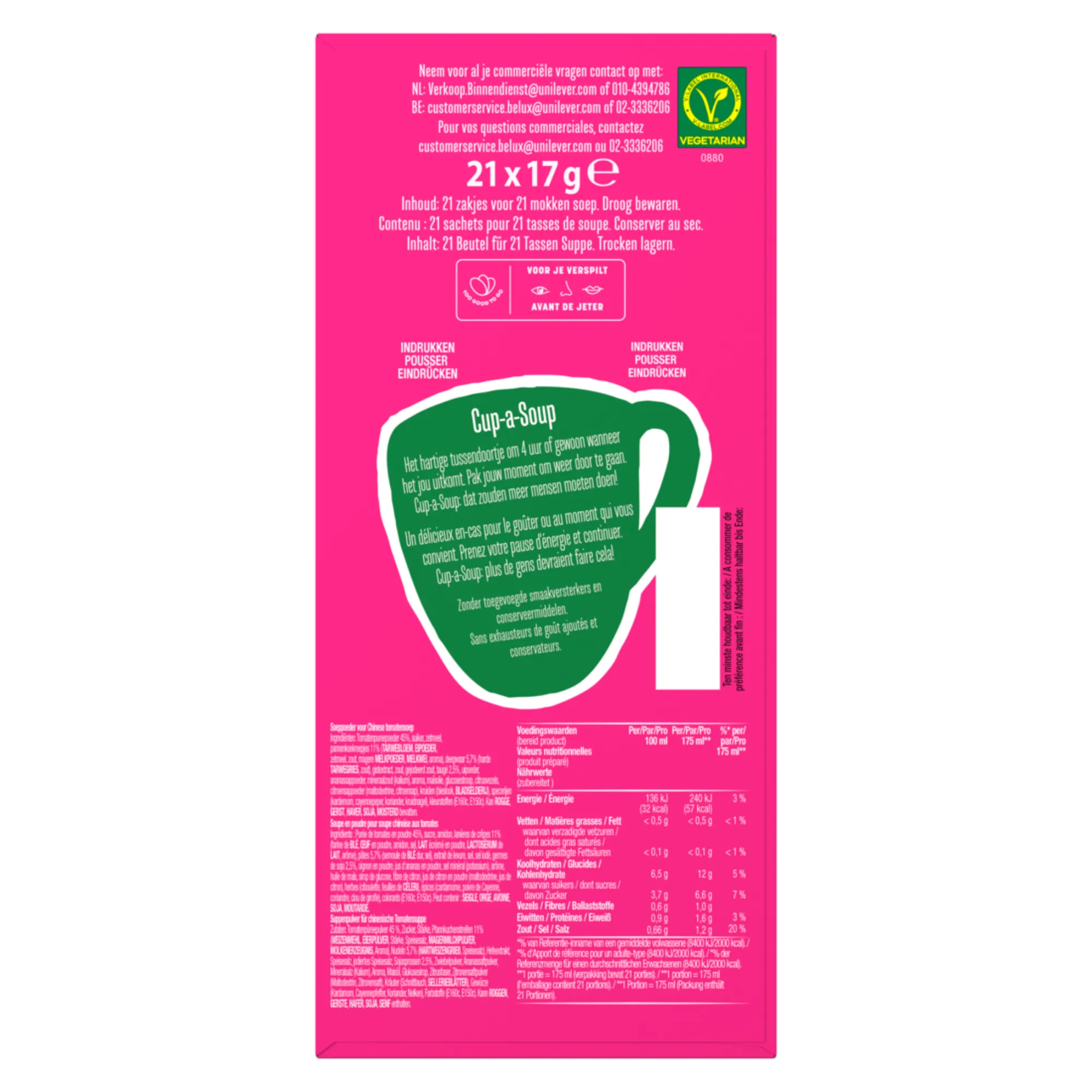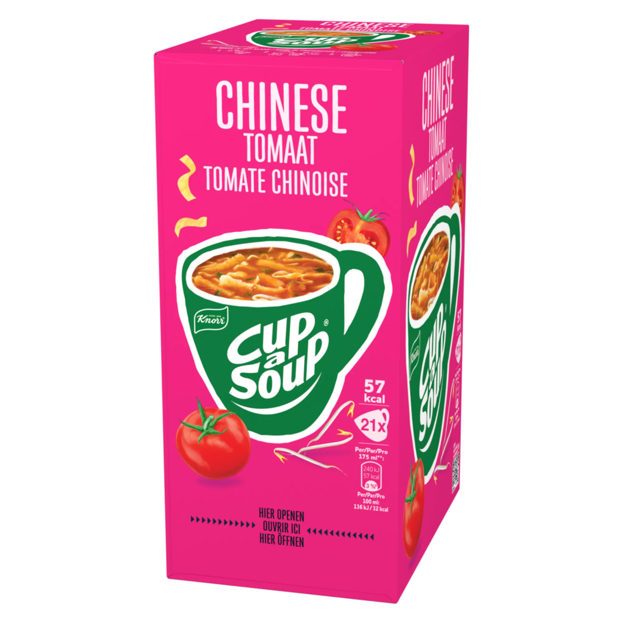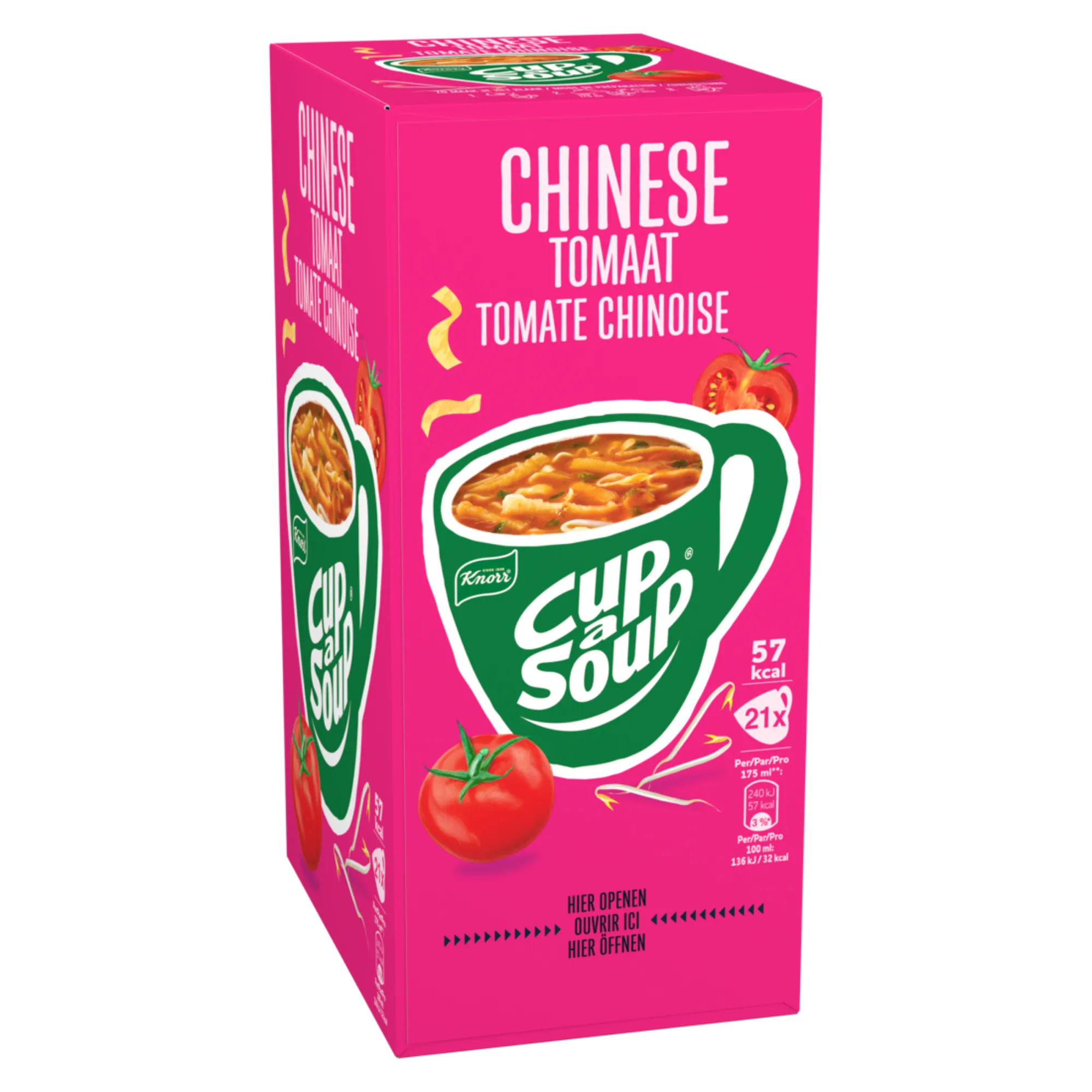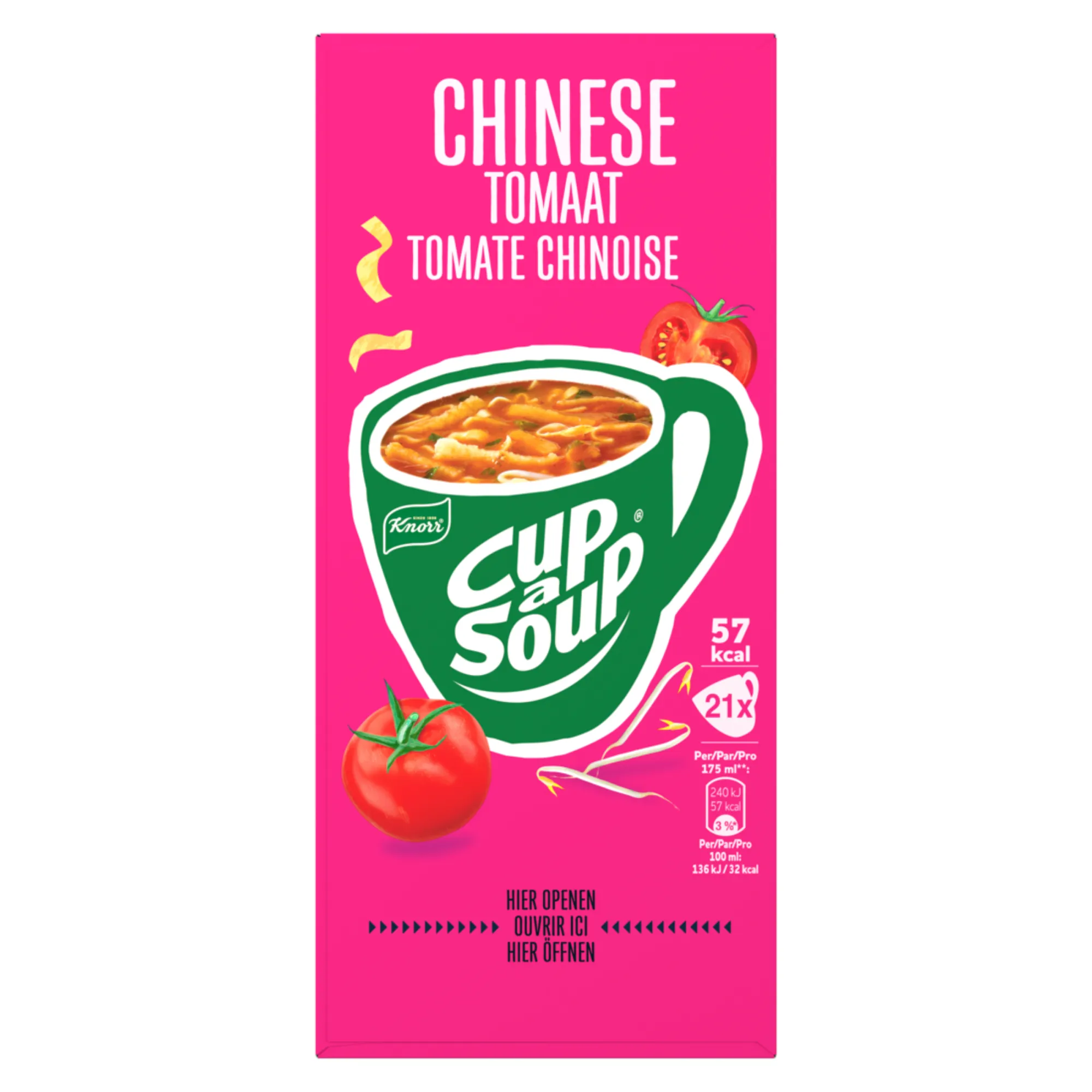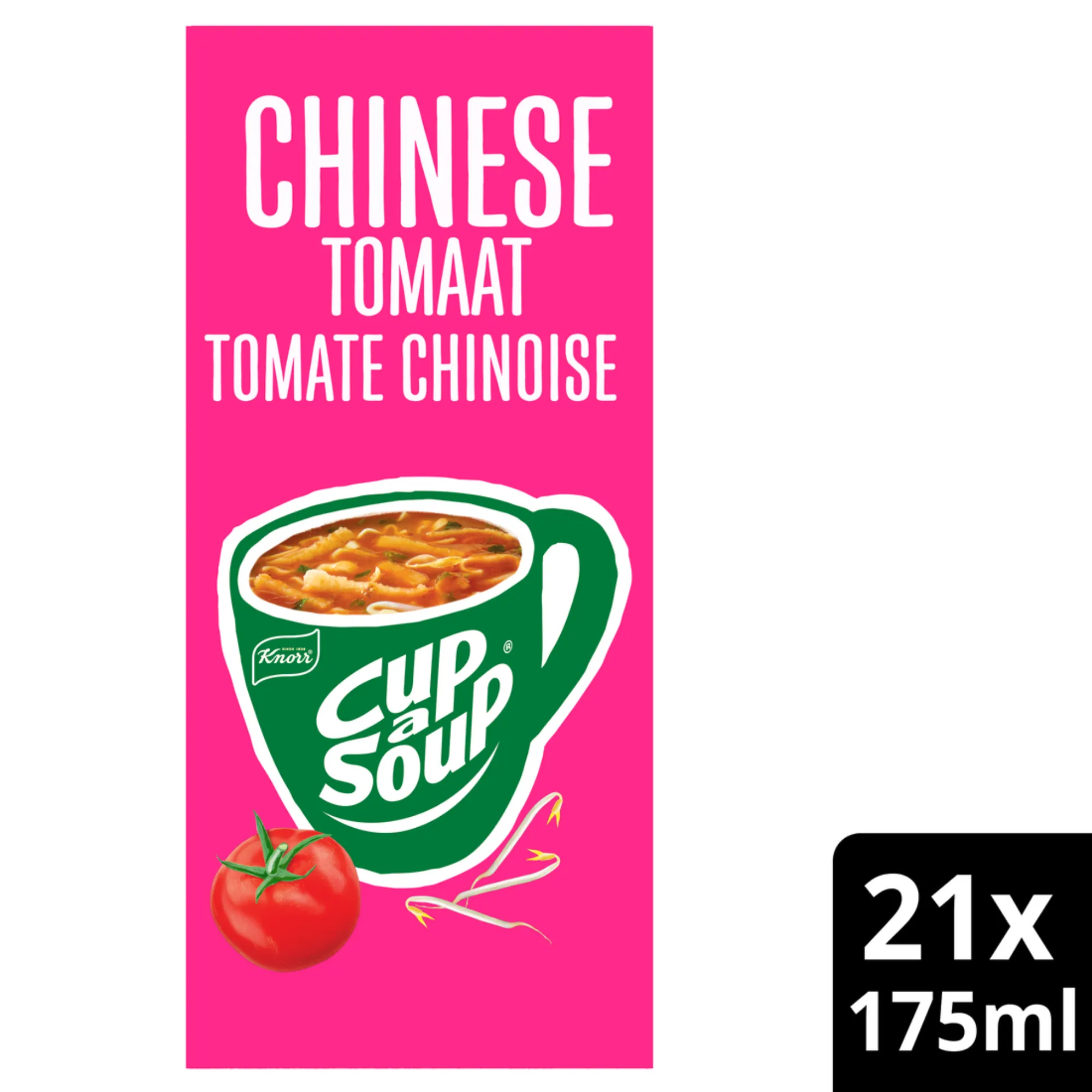 Knorr Cup-a-Soup Chinese Tomaat (21 x 175ml), dé ideale snelle, hartige snack voor op het werk of thuis. Deze smaakvolle tomatensoep met een subtiele oosterse twist combineert de friszoete smaak van duurzaam geteelde tomaten met heerlijke specerijen zoals koriander, kruidnagel en cayennepeper. Perfect als tussendoortje op een drukke dag of als lichte maaltijdvervanger. Deze soep bevat geen kunstmatige kleurstoffen, conserveermiddelen of toegevoegde smaakversterkers, puur genieten van natuurlijke ingrediënten. Met 21 zakjes in één verpakking heb je altijd een snelle, lekkere soep binnen handbereik.