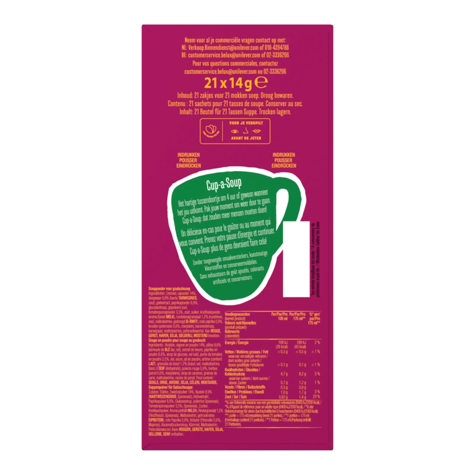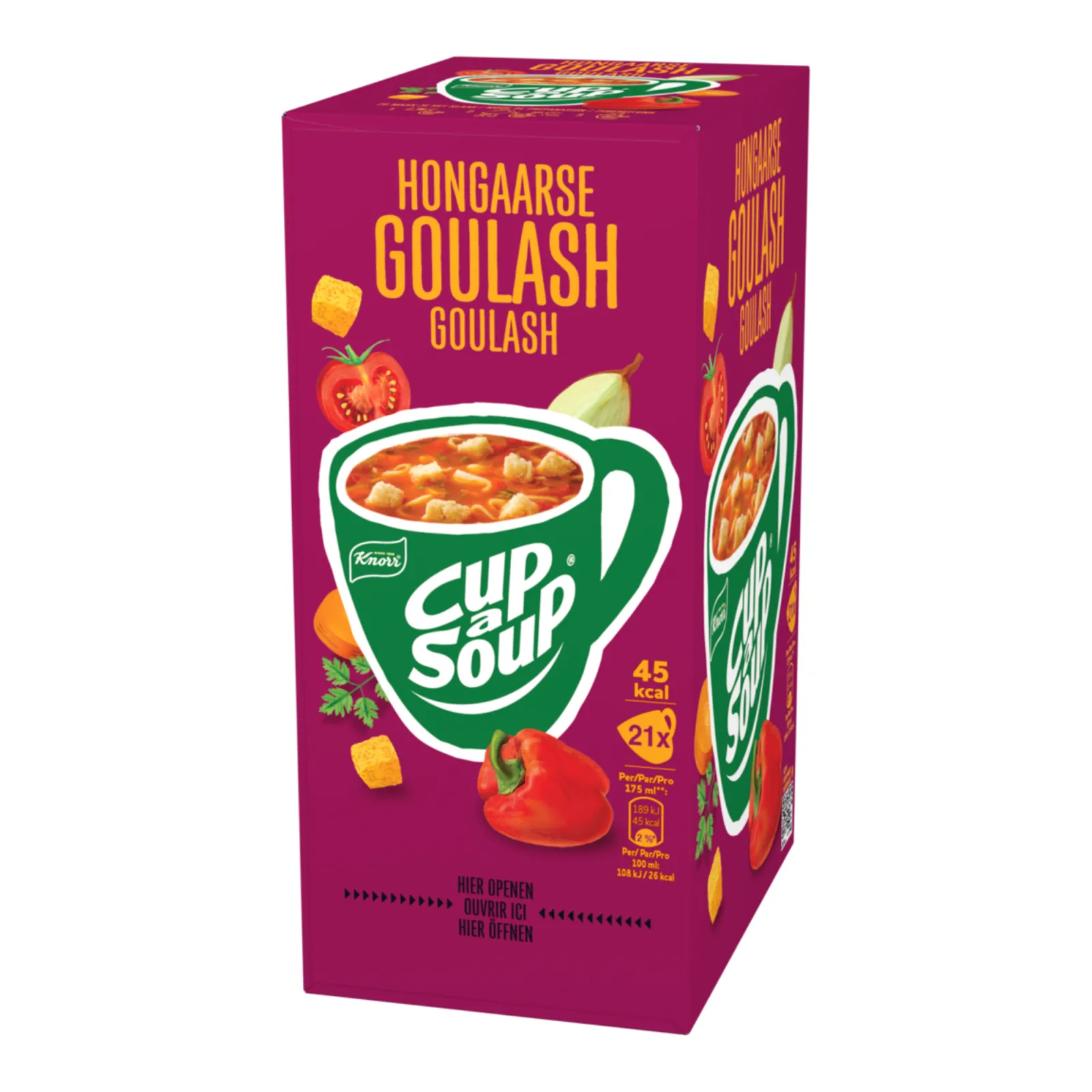 Knorr Cup-a-Soup Hongaarse Goulash in een verpakking van 21 zakjes zodat je altijd een snelle hartige opkikker bij de hand hebt tijdens werk school of thuis. Deze variant heeft een volle krachtige smaak met een Hongaars tintje dankzij paprika tomaat en kruidige accenten die zorgen voor een warm en rijk soepmoment. Met slechts 56 calorieën per mok is het een ideale snack voor tussendoor en perfect voor iedereen die even wil opladen en weer scherp door wil. De soep bevat geen kunstmatige kleurstoffen en geen toegevoegde smaakversterkers waardoor je kunt genieten van een vertrouwde pure smaak. De bereiding is simpel en snel, je giet 175 ml kokend water op de inhoud van het zakje, roert even, wacht een minuutje en klaar is je heerlijke kom soep. Door de verpakking van 21 porties is dit product ideaal voor kantoor, horeca en thuis.