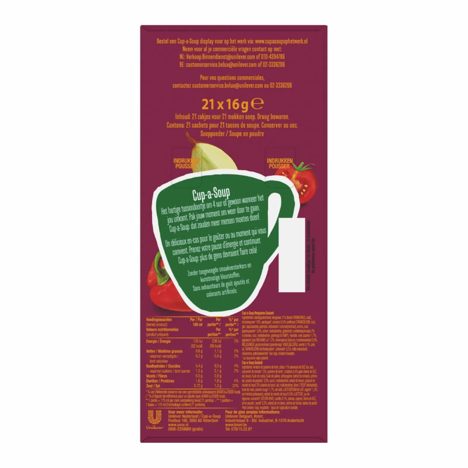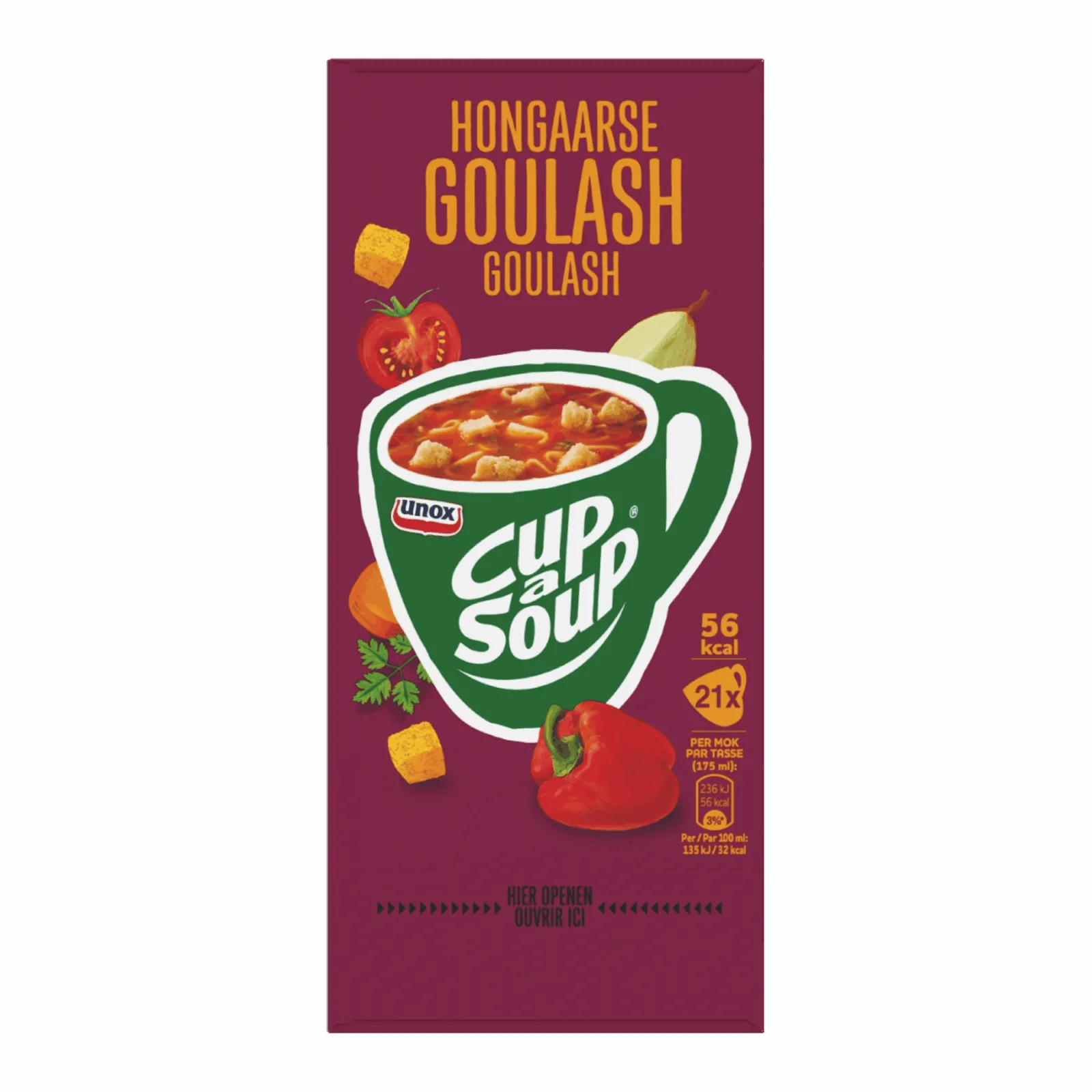 Bij Compliment.nl koop je voordelig Knorr Cup a Soup Hongaarse Goulash in een verpakking van 21 zakjes zodat je altijd een snelle hartige opkikker bij de hand hebt tijdens werk school of thuis. Deze variant heeft een volle krachtige smaak met een Hongaars tintje dankzij paprika tomaat en kruidige accenten die zorgen voor een warm en rijk soepmoment. Met slechts 56 calorieën per mok is het een ideale snack voor tussendoor en perfect voor iedereen die even wil opladen en weer scherp door wil. De soep bevat geen kunstmatige kleurstoffen en geen toegevoegde smaakversterkers waardoor je kunt genieten van een vertrouwde pure smaak. De bereiding is simpel en snel je giet 175 ml kokend water op de inhoud van het zakje roert even wacht een minuutje en klaar is je heerlijke mok soep. Door de verpakking van 21 porties is dit product ideaal voor kantoor pantry horeca en thuisgebruik. De ingrediënten zijn zorgvuldig samengesteld voor een smaakvol resultaat zodat jouw 4 uur moment altijd geslaagd is.