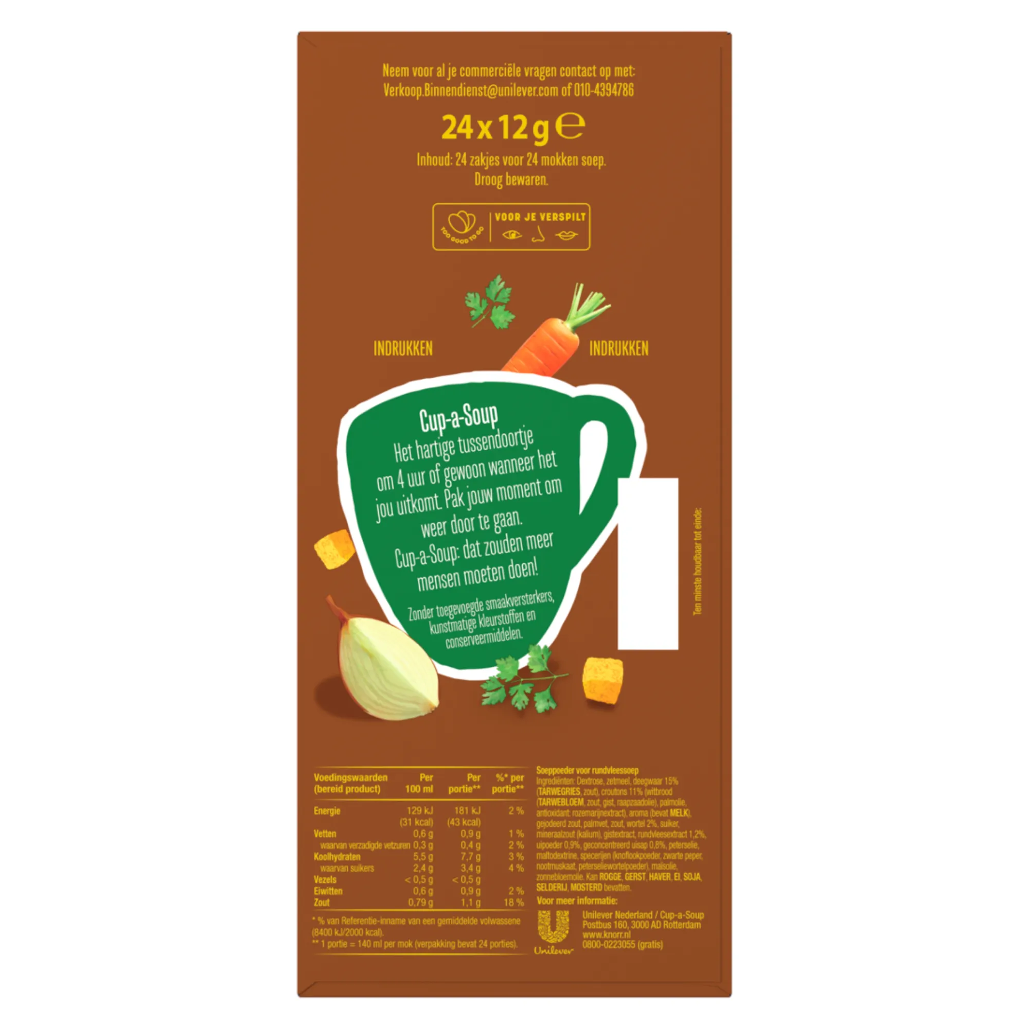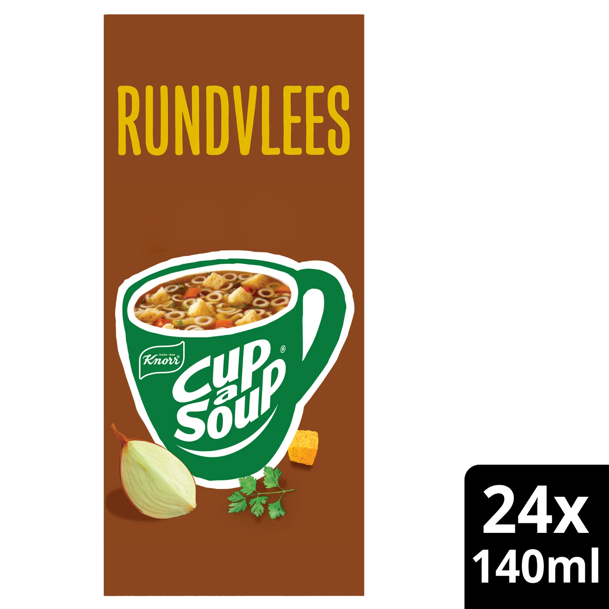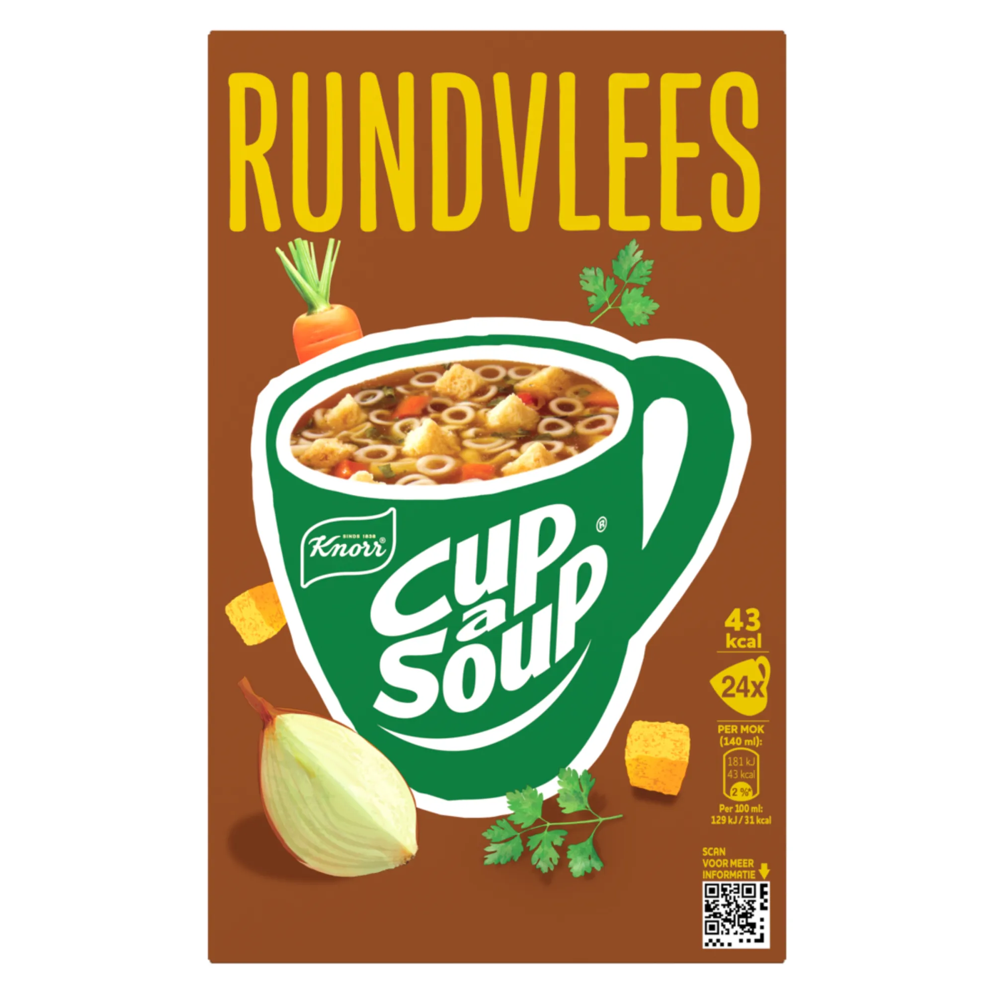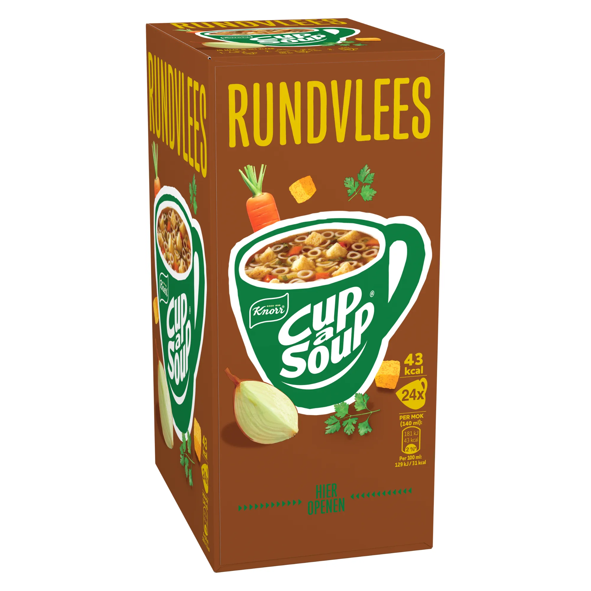 Knorr Cup-a-Soup Rundvlees (24x 140ml) is een hartige instant moksoep met de volle smaak van rundvleesbouillon. Deze klassieke soep is ideaal als warm tussendoortje tijdens een drukke werkdag of als snelle opkikker in de pauze. De rijke bouillonsmaak zorgt voor een stevige, hartige smaakbeleving. Dankzij de handige portiezakjes maak je eenvoudig een mok soep: voeg 140 ml kokend water toe, roer even door en binnen een minuut is de soep klaar. De verpakking bevat 24 zakjes, perfect voor kantines, vergaderruimtes of kantoorvoorraden.