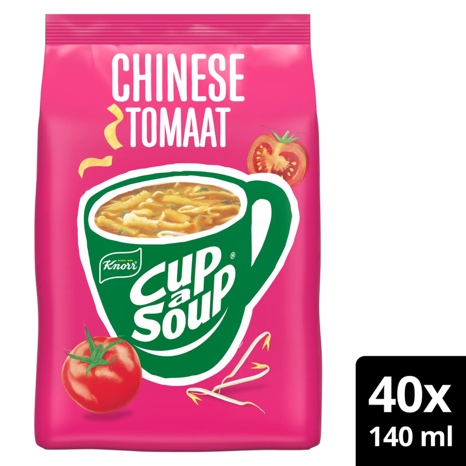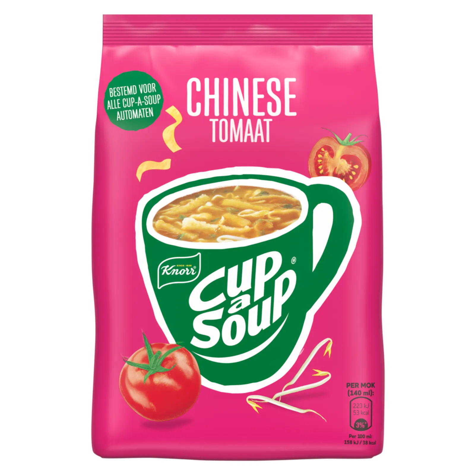 Knorr Cup-a-Soup Vending Chinese Tomaat is speciaal ontwikkeld voor gebruik in soepautomaten. Deze populaire variant combineert de frisse smaak van tomaat met een licht oosterse kruiding, wat zorgt voor een hartige en verwarmende mok soep. Dankzij de uitgebalanceerde smaak is deze soep een geliefde keuze in kantines, bedrijven en andere locaties met vendingmachines. De verpakking bevat 4 vendingzakken, waarbij elke zak goed is voor ongeveer 40 porties soep van 140 ml. Ideaal voor locaties waar snel en eenvoudig een warme soep geserveerd moet worden.