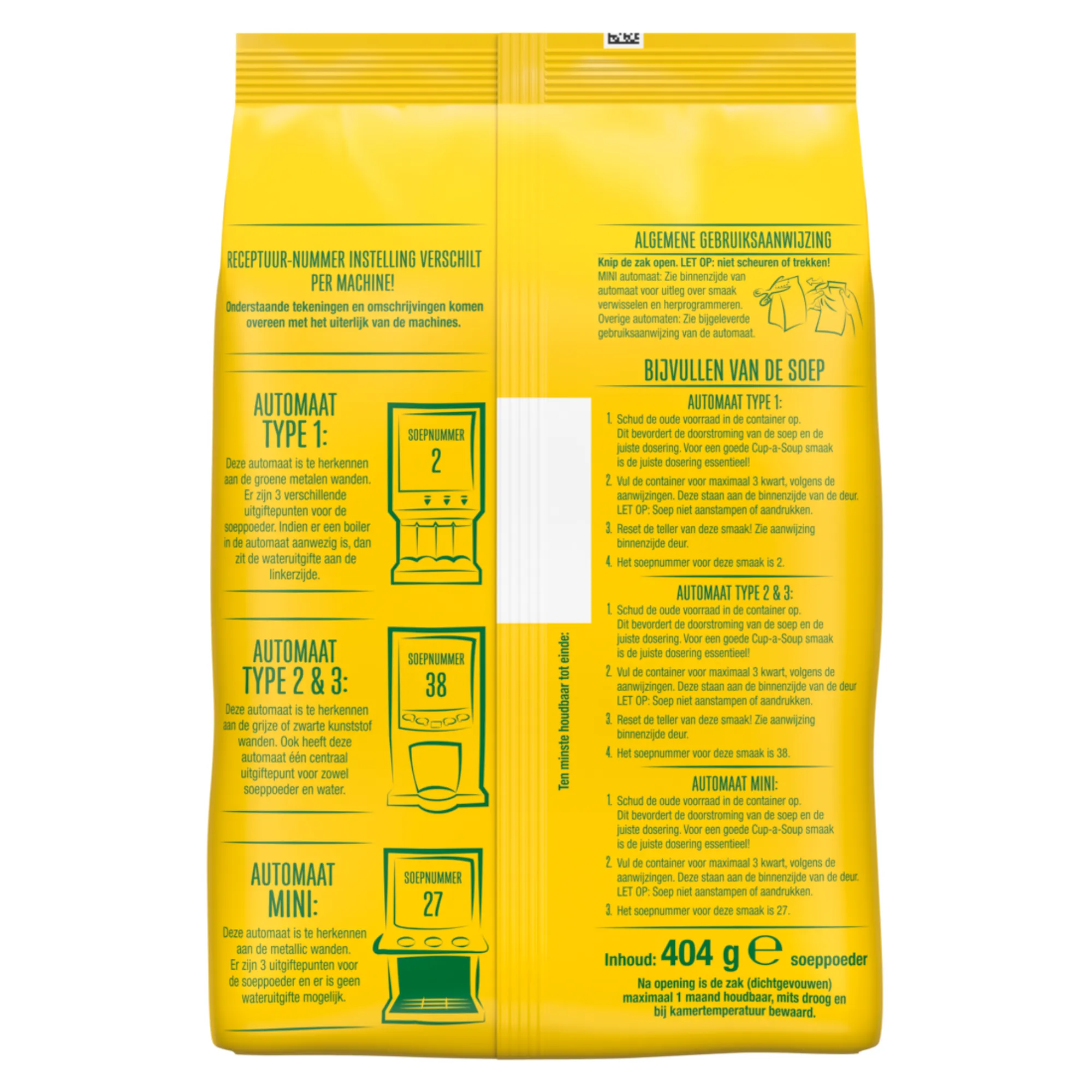 Knorr Cup-a-Soup Vending Kip (4 zakken) is speciaal ontwikkeld voor gebruik in soepautomaten en vendingmachines. Deze verpakking bevat 4 vendingzakken, elk goed voor meerdere porties, waardoor hij ideaal is voor kantines, bedrijven en locaties met veel gebruikers. De soep heeft een hartige kipsmaak en zorgt voor een snelle, warme opkikker tijdens werkpauzes. Dankzij de consistente dosering via de automaat krijgt iedere gebruiker een smaakvolle mok soep met de vertrouwde kwaliteit van Knorr.