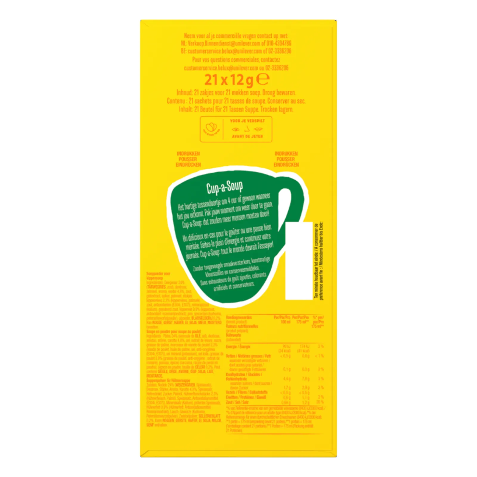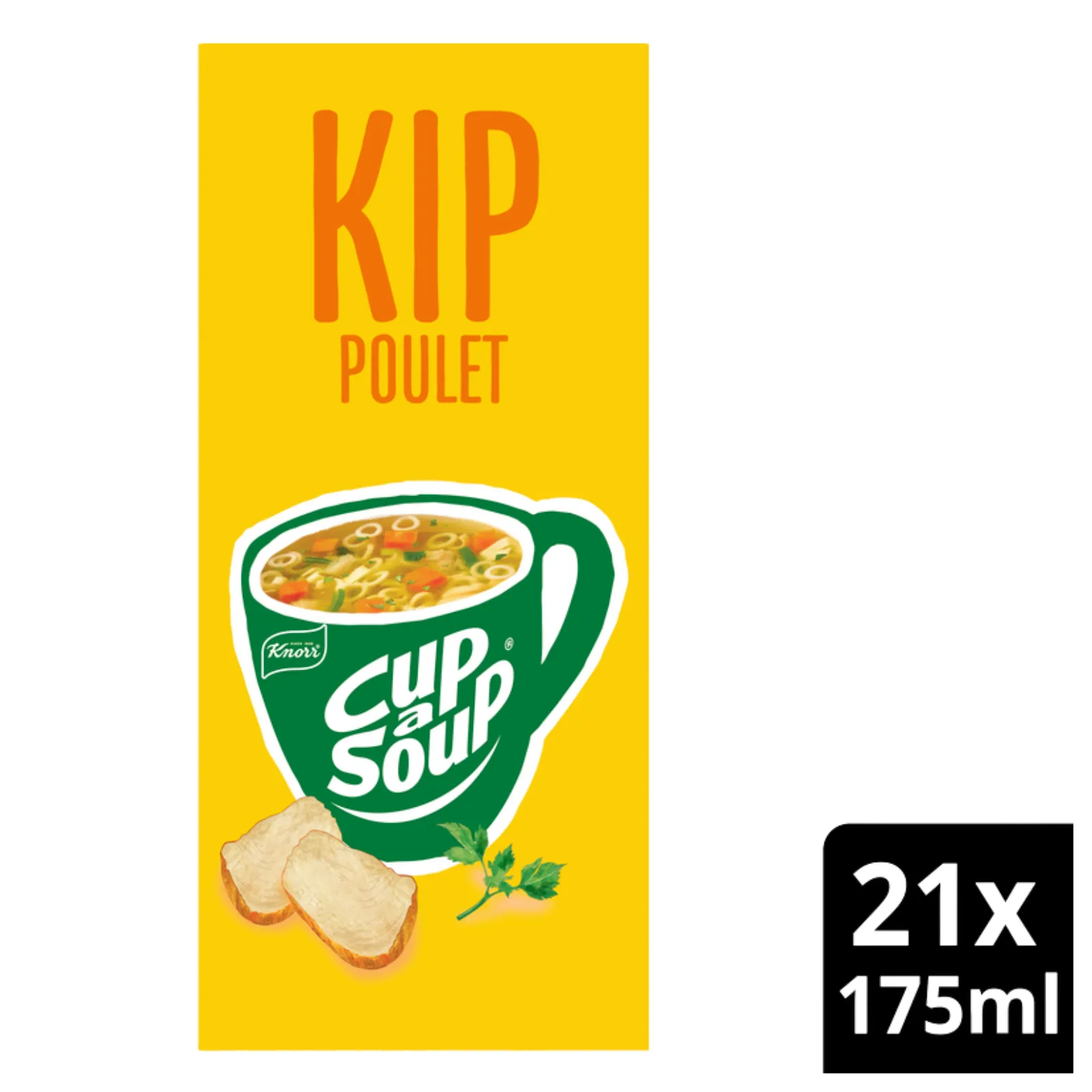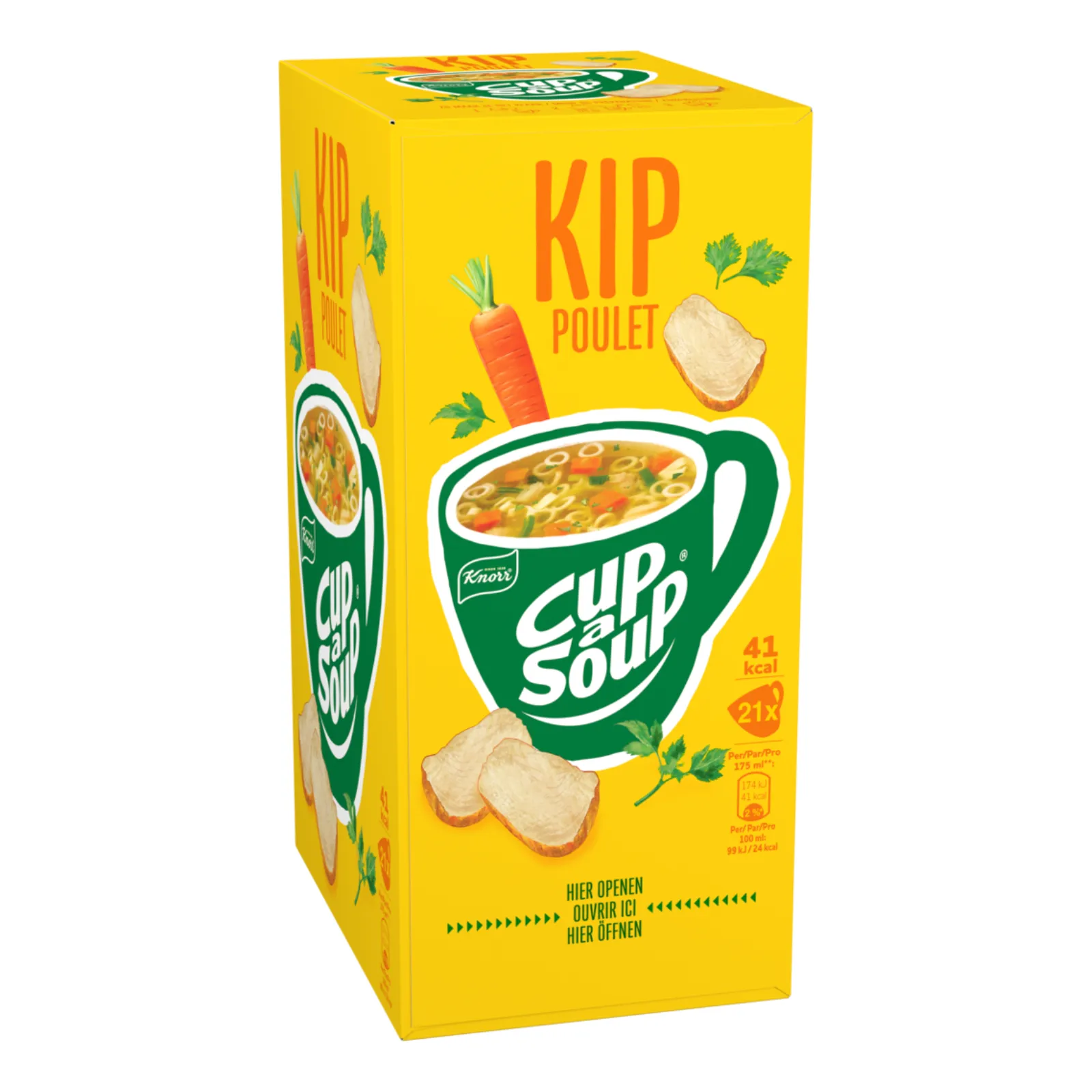Knorr Cup-a-Soup Kip biedt een vertrouwde, hartige opkikker die perfect past in elke voorraadkast. Deze heldere kippensoep met fijne deegwaar en kruidige groenten is de ideale snelle snack voor onderweg of tijdens een korte pauze op de werkvloer. Met een doos van 21 porties heb je altijd een warme traktatie klaarstaan voor gasten en bezoekers. De bereiding is uiterst eenvoudig: alleen kokend water toevoegen, even roeren en genieten. Een verantwoorde keuze zonder toegevoegde smaakversterkers of kunstmatige kleurstoffen, perfect voor een moment van energie en comfort gedurende de dag.