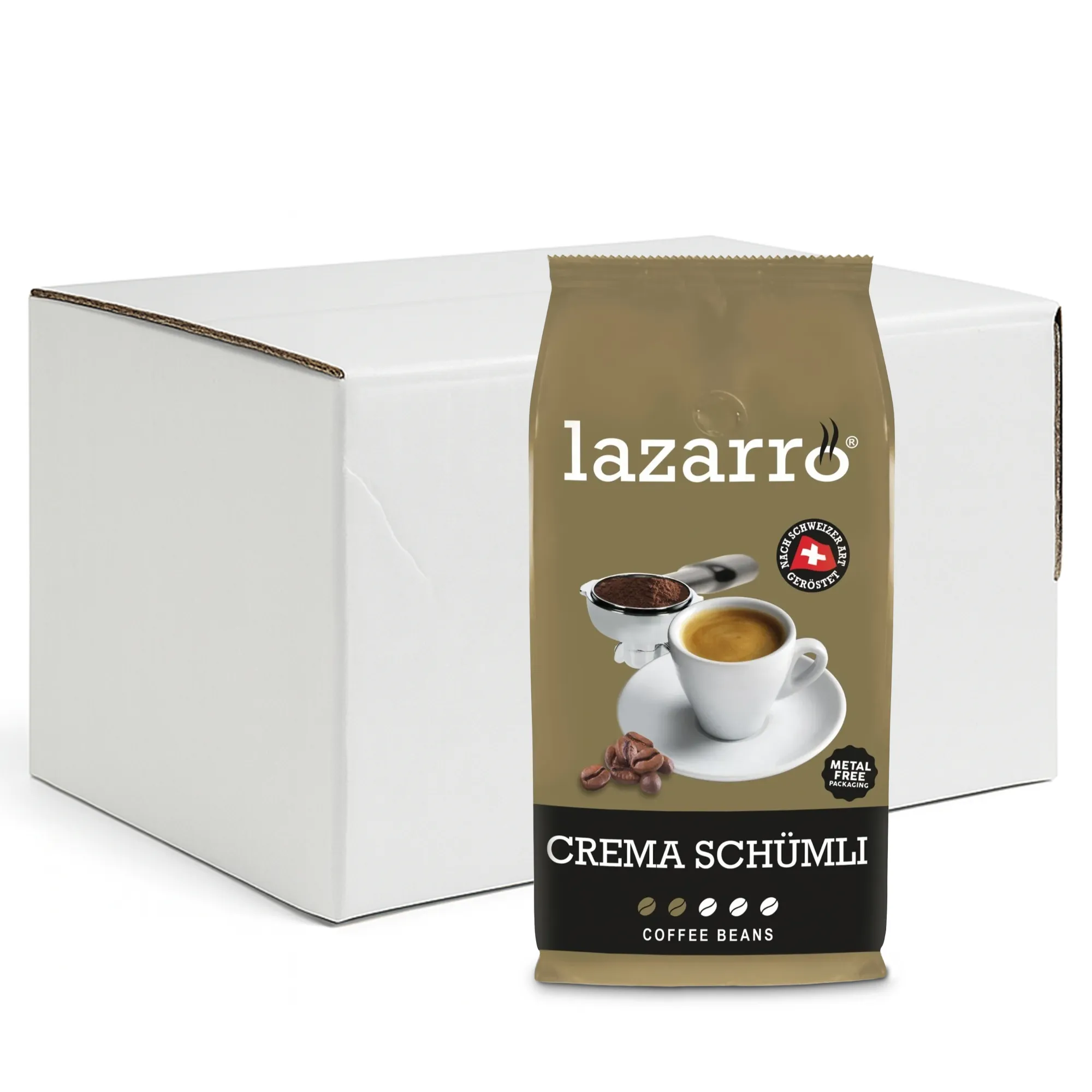 Bij Compliment.nl koop je voordelig Lazarro Crema Schümli Bonen in een doos met 8 zakken van 1 kg, speciaal samengesteld voor grootverbruik in horeca, kantines, kantoren en zorginstellingen. Deze milde en evenwichtige blend van Arabica- en Robusta-bonen is geïnspireerd op de Zwitserse brandtraditie en levert een zachte smaak met tonen van chocolade en kruiden, afgerond met een frisse, romige afdronk. Dankzij de rijke crème-laag is deze koffie bijzonder geschikt voor het bereiden van espresso, cappuccino en caffè crema. De grootverpakking maakt voorraadbeheer eenvoudig en voordelig, terwijl de constante kwaliteit van Lazarro garant staat voor een smaakvolle ervaring bij elk kopje. Met deze professionele koffiemelange combineer je gemak, verfijning en betrouwbaarheid in één product.