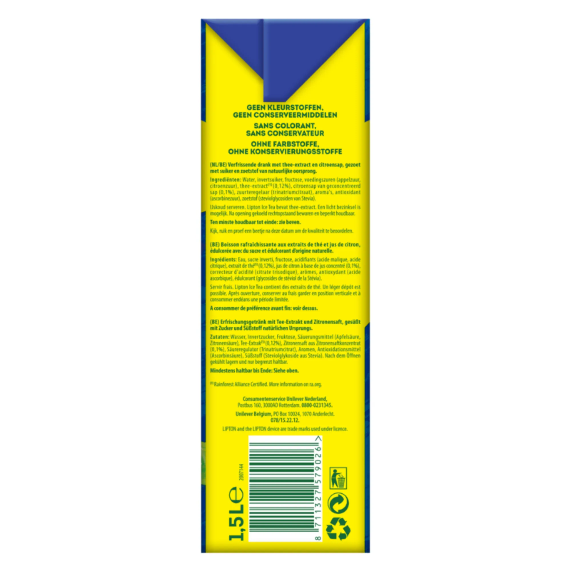 Lipton Ice Tea Lemon is een heerlijk verfrissende ijsthee die het best ijskoud geserveerd kan worden. Deze koolzuurvrije frisdrank met thee-extract en citroensap is laag in calorieën en gezoet met suiker en zoetstof van natuurlijke oorsprong.