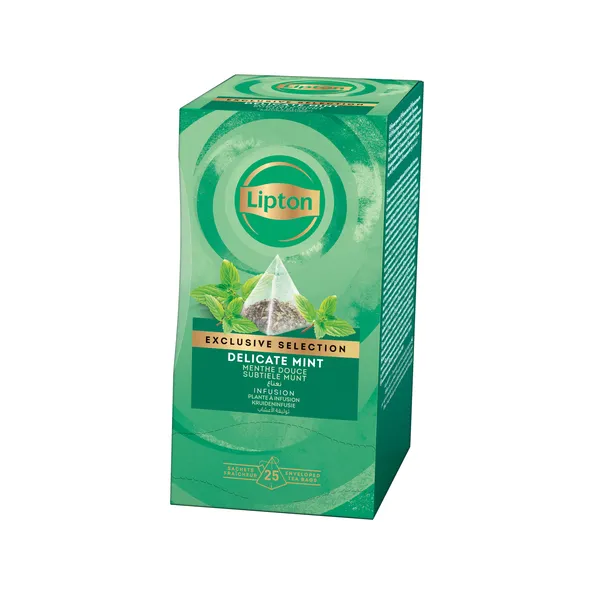 Lipton Exclusive Selection Subtiele Munt koop je snel en eenvoudig online bij groothandel Compliment.nl. De prijs is voor 6 pakjes Lipton Exclusive Selection. In een pakje zitten 25 buideltjes van 2 gram. In totaal ontvang je dus 150 buideltjes.  Lipton Exlusive Selection Subtiele Munt heeft de verfrissende en subtiele smaak van munt. In de zakjes mintthee zitten lange theebladeren, kruiden en dat gecombineerd met zichtbare stukjes bloemen & fruit. De theezakjes zijn piramidevormig en zorgt daardoor voor een uitstekende smaak. Alle producten zijn volledig recyclebaar.