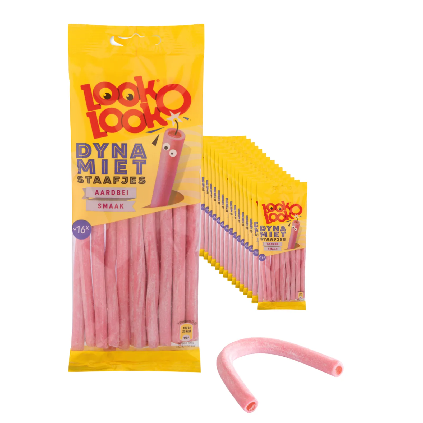 De Look-O-Look Dynamietstaafjes Aardbei – 15 x 110 g zijn zachte zoete snoepstaafjes met een herkenbare aardbeiensmaak. De staafjes hebben een soepele bite en zijn kleurrijk vormgegeven, wat ze populair maakt bij zowel kinderen als volwassenen. Dankzij de losse staafjes zijn ze ideaal voor traktaties, snoeptafels, feestjes of verkoop per stuk. Look-O-Look staat bekend om speels snoep met een opvallend uiterlijk en toegankelijke smaken, en deze aardbeistaafjes passen daar perfect bij. Met deze voordeelverpakking van 15 zakken heb je altijd voldoende voorraad voor elk zoet moment.