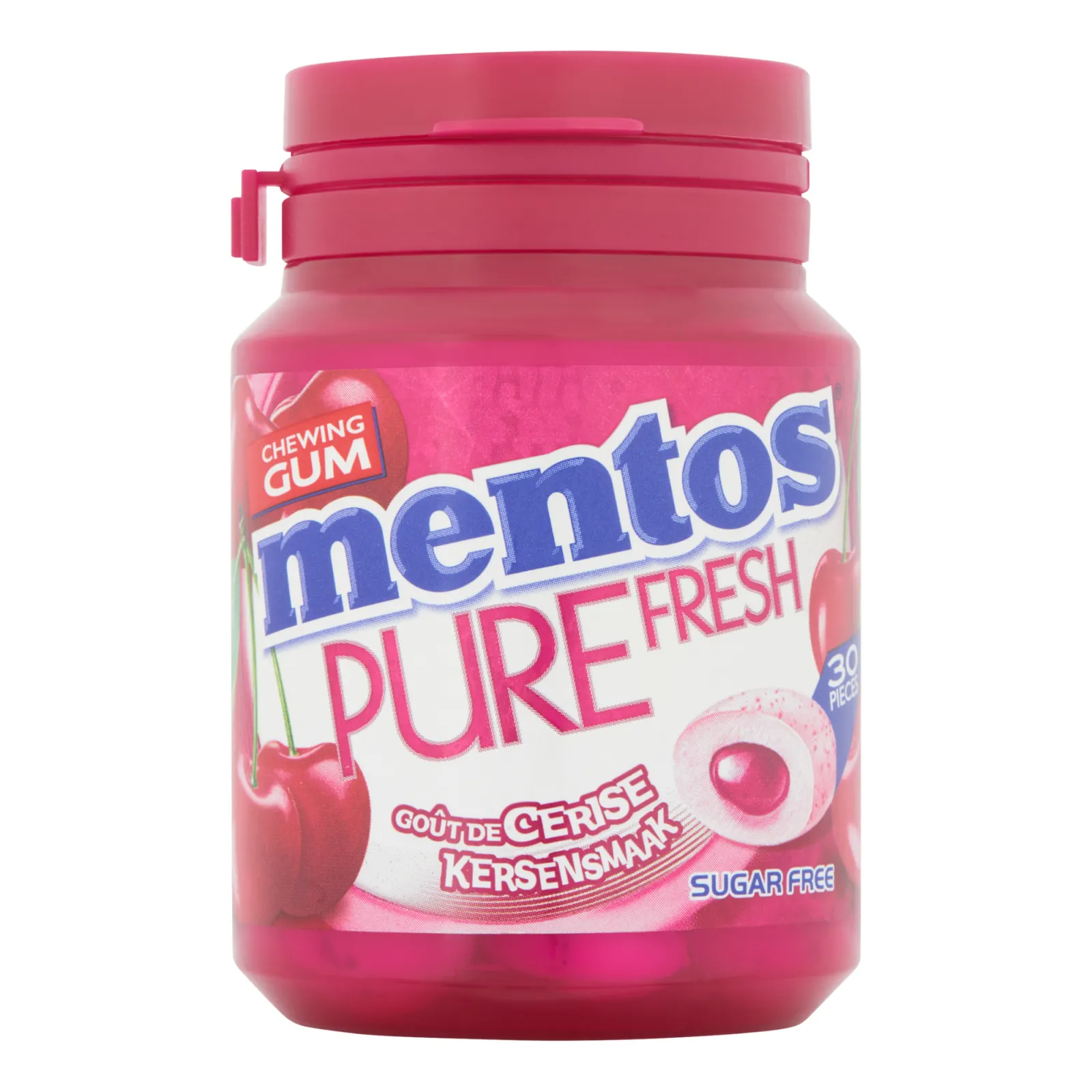 De Mentos Gum Pure Fresh Kers is een suikervrije kauwgom met een frisse kersensmaak, verpakt in een praktische hersluitbare bottle van 60 gram. De combinatie van fruitige smaak en frisse kauwervaring maakt deze kauwgom ideaal voor onderweg, op kantoor of thuis. Met 30 stukjes per bottle heb je altijd voldoende voorraad en pak je eenvoudig een kauwgompje wanneer je toe bent aan een frisse adem.