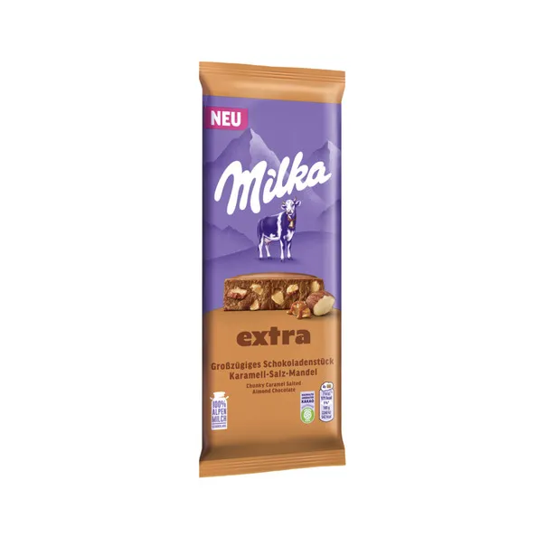 Milka Extra: gemaakt met Extra Chocolade en Extra Smaak om Extra te genieten! Deze variant combineert de bekende Milka melkchocolade, met gekarameliseerde amandelen en met een vleugje zout. Zachte melkchocolade gemaakt van 100% alpenmelk Gevuldmet gezouten en gekarameliseerde amandelen. Extra Chocolade en Extra Smaak, om Extra te genieten. Met duurzaam aangekochte cacaobonen uit het Cocoa Life programma