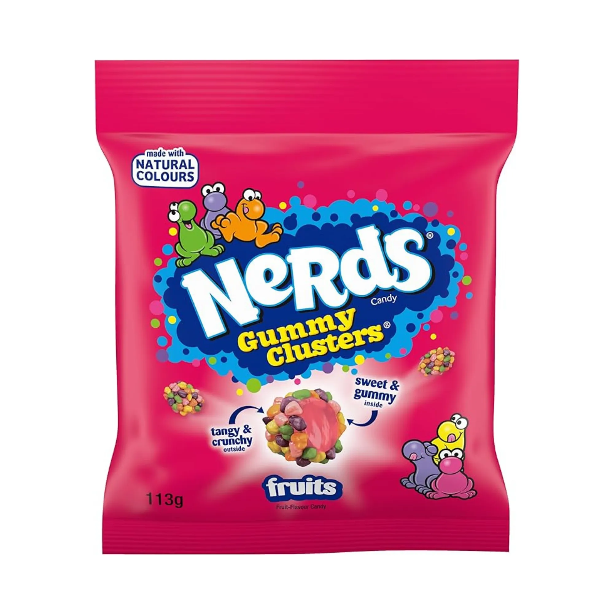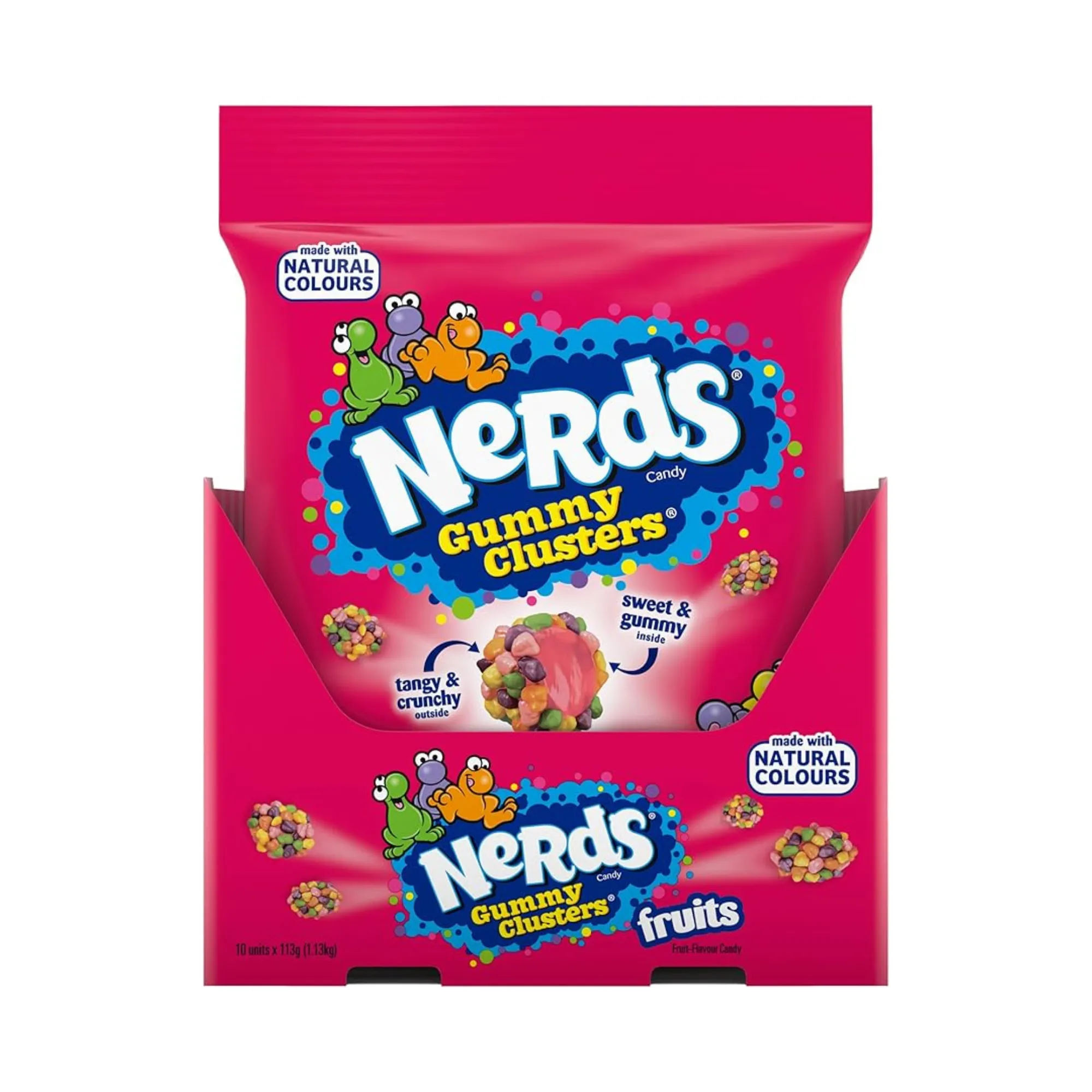 Nerds Gummy Clusters Fruits (10×113 gram) zijn zachte fruitgummies omhuld met knapperige Nerds-snoepjes. Deze unieke combinatie van chewy gummy en crunchy candy zorgt voor een speelse textuur en een intens fruitige smaakmix. De kleurrijke clusters brengen verschillende fruitsmaken samen in één hap en zijn daardoor populair binnen het internationale snoepschap. De doos bevat 10 zakjes van 113 gram, ideaal voor wederverkoop, impulsaankopen of als opvallend Amerikaans snoepproduct.