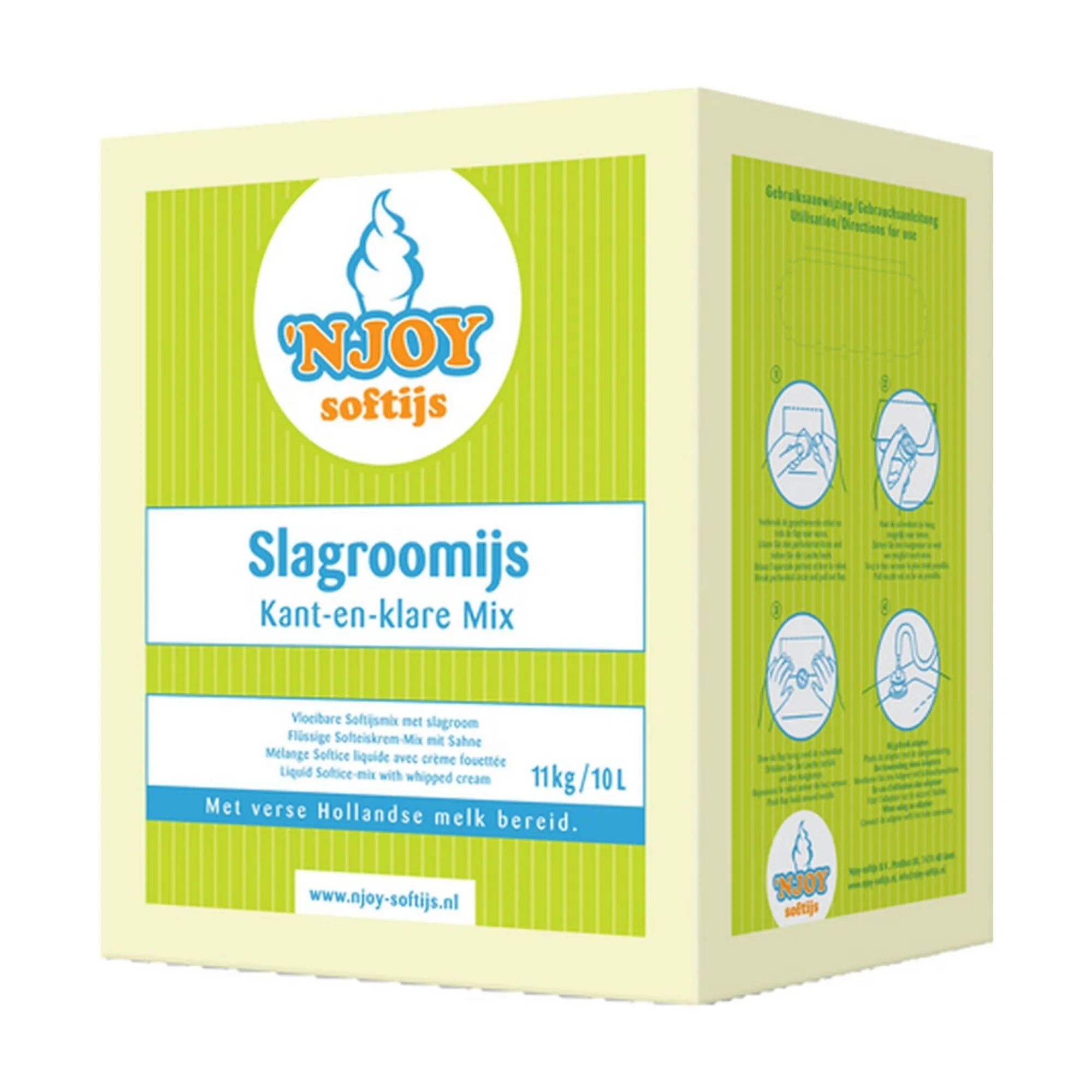 NJOY vloeibaar slagroomijs is bereid van melk, room en boter. Het ijs heeft een zachte, romige smaak en vormt een goede basis voor desserts. Dit product wordt geleverd in grootverpakking voor gebruik in de professionele keuken.