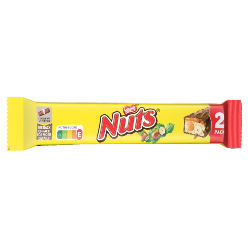 Nestlé Nuts chocolade 2-pack zijn 2 stevige candybars met een rijke combinatie van zachte nougat, een laagje karamel en knapperige hazelnoten omhuld in melkchocolade. Nestlé Nuts snoep zorgt ervoor dat je er weer tegenaan kunt en net even wat meer durft. De Nuts repen zijn handig per 2 verpakt en worden veel verkocht in kantines en sportkantines, pompshops en snoepwinkels. Dankzij zijn authentieke smaak is het nog altijd een enorm populaire candybar. Voordelig Nestlé Nuts bar in duo pack kopen doe je natuurlijk bij online groothandel Compliment.nl per 24 2 packs à 60 gram. Ontdek ook de rest van ons uitgebreide assortiment aan candybars hier, zo verkopen wij ook de Nestlé Nuts 42 gram (de kleinere variant van de kingsize).