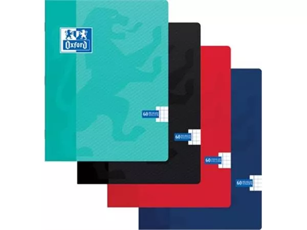 OXFORD SCHRIFT A5 Q5 120BLZ*Oxford SCHOOL schrift. geassorteerde kleuren. ft A5. 120 bladzijden. geruit 5 mm*Met Optik Paper. Laat geen inkt door. zelfs als je schrijft met vulpen. Hoge kwaliteit 90 grams papier. extra glad en extra wit. Soepele geplastificeerde kartonnen kaft. Ronde hoeken om ezelsoren te voorkomen. EU Ecolabel gecertificeerd.*ft 16.5 x 21 cm (schrift). 120 bladzijden (60 vel). geruit 5 mm. geassorteerde kleuren: rood. aqua. blauw en zwart