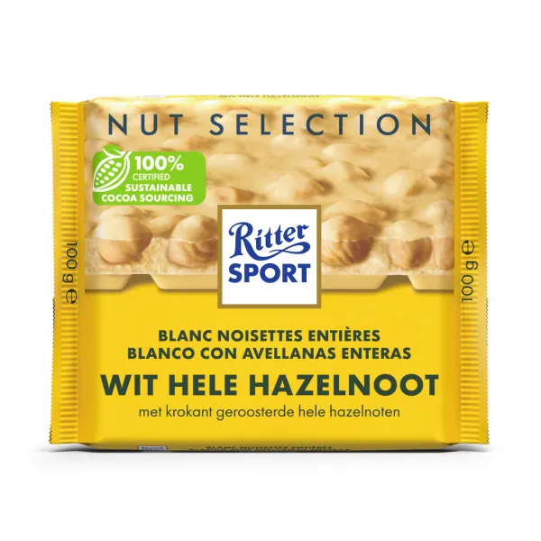 Deze witte chocoladereep smelt echt weg op je tong. En dan zitten er ook nog knapperige, geroosterde hele hazelnoten in en gepofte rijst. Wat een smaakbeleving! Romige chocolade boordevol hazelnoten, onweerstaanbaar lekkere smaak en bijzonder goede kwaliteit, uitsluitend natuurlijke ingrediënten en 100% gecertificeerde, duurzame cacao (Rainforest Alliance). Ritter Sport maakt al meer dan honderd jaar heerlijke chocolade van 100% gecertificeerde, duurzame cacao. Dus met oog voor de boeren en de natuur. Zo smaakt chocolade nog beter. Zelfs zo lekker, dat je ‘m met niemand wil delen. En dat hoeft ook helemaal niet. Dit unieke vierkante formaat is perfect voor jezelf. Smullen maar!