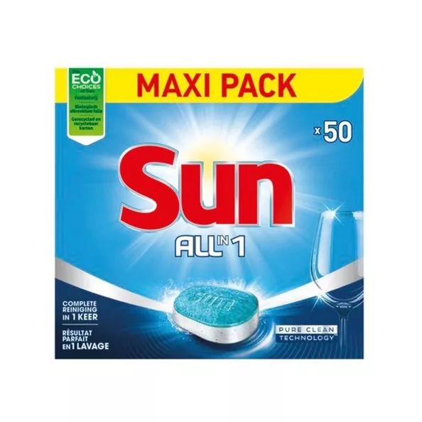 Voordeelvolume Sun vaatwastabletten. Zeer goedkoop. Ook voor particulieren. In deze voordeelverpakking zitten 50 SUN vaatwastabletten. Deze Sun all in 1 vaatwastabletten hebben een ingebouwde spoelglans- en zoutfunctie. Zo verwijder je de hardnekkigste vlekken zonder voorspoelen.