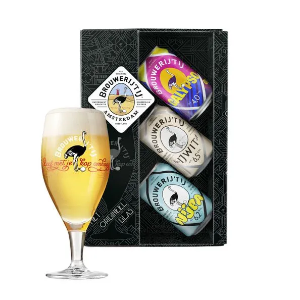 Geschenkverpakking Bouwerij t'IJ. Inhoud bierpakket: Zatte tripel 33cl, IPA 33cl, IJwit 33cl + 1x Brouwerij 't IJ glas.