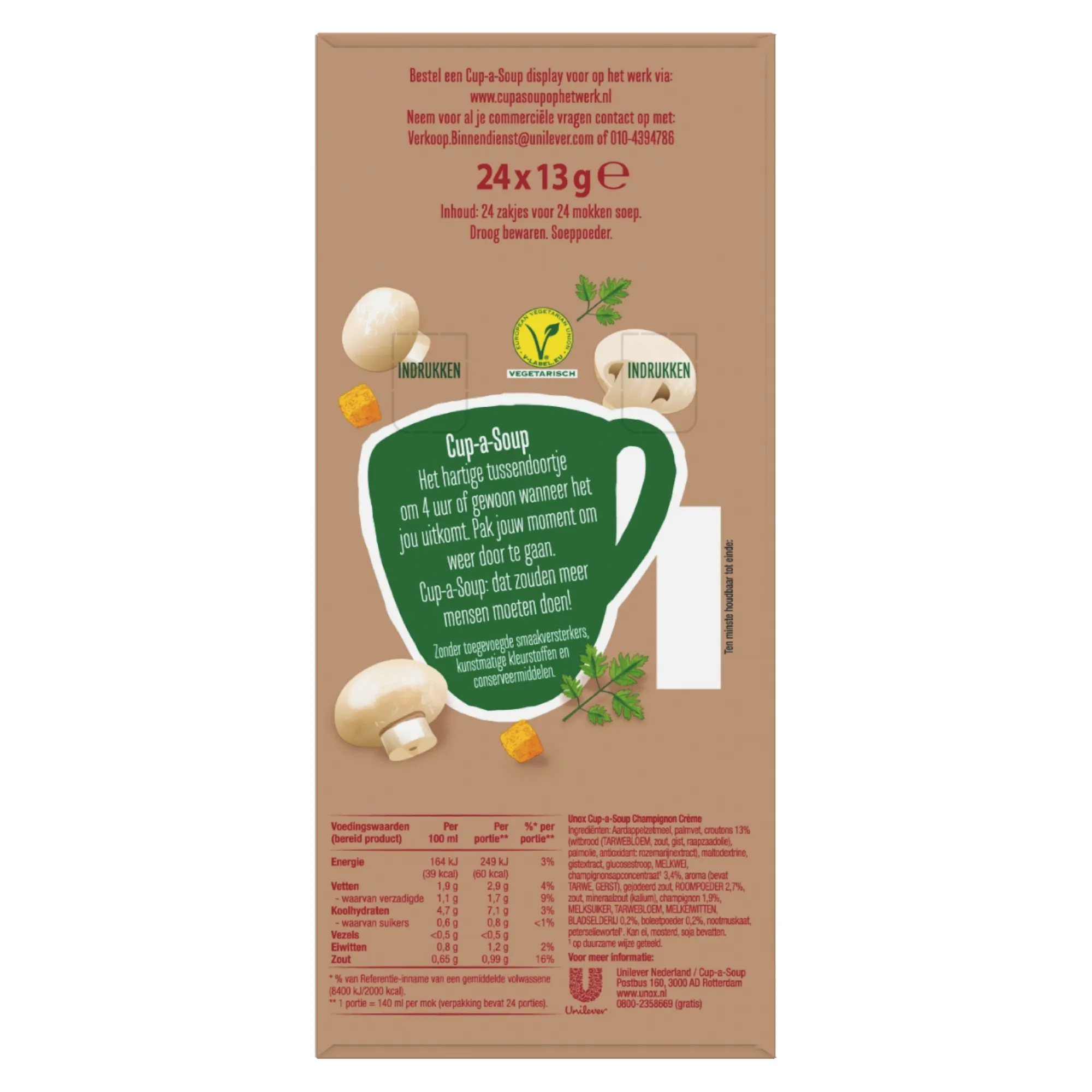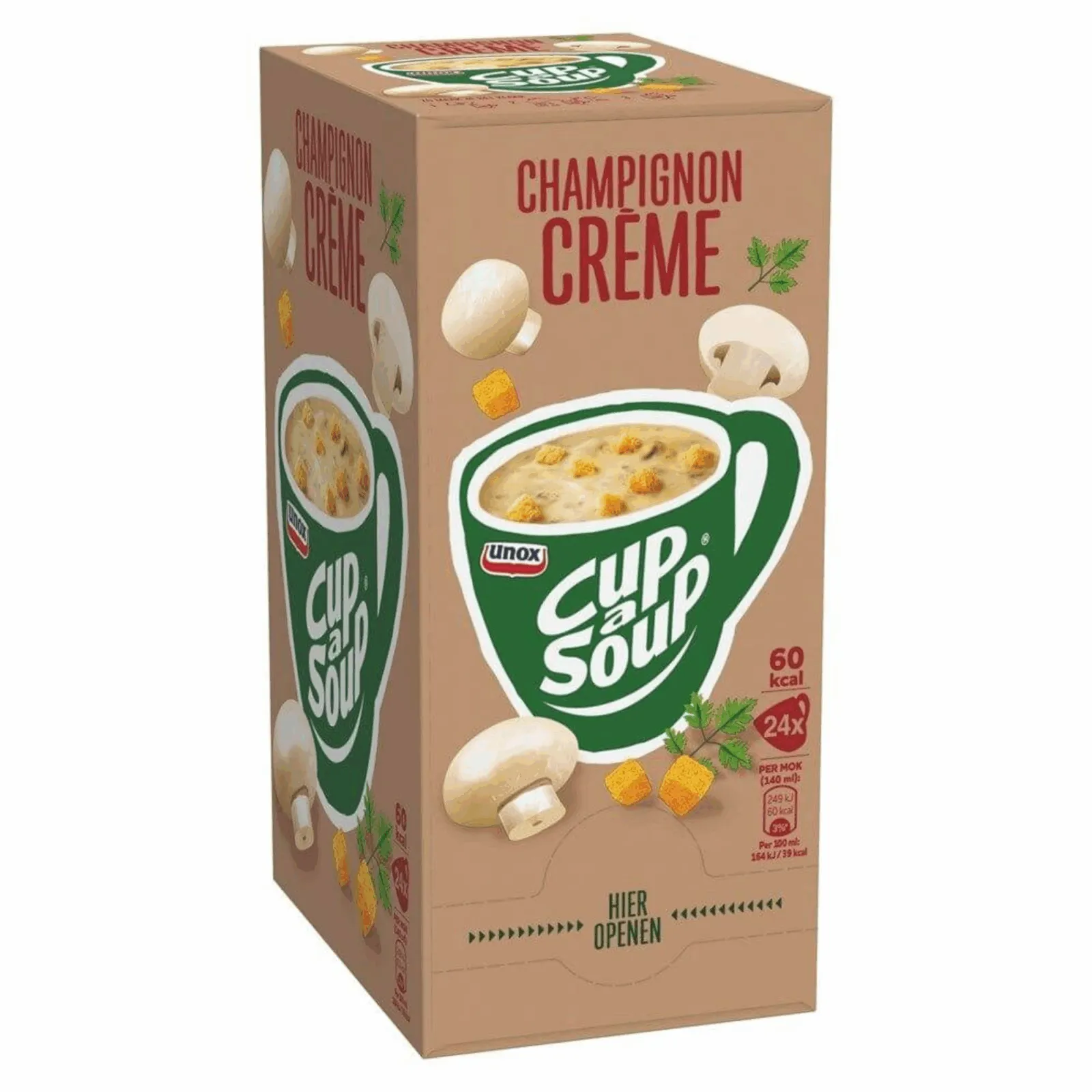 Opzoek naar de allerlekkerste crème-soep? Dan ben je bij Compliment.nl aan het juiste adres. Wij verkopen de Unox Cup-a-Soup Champignon crème. In deze Cup-a-Soup variant zitten geen smaakversterkers, kunstmatige kleurstoffen en conserveermiddelen. Deze opkikker geeft jou net dat zetje energie om weer door te gaan met jouw dag. Het is daarnaast geschikt voor vegetariërs. Bestel eenvoudig en voordelig een pak met 24 zakjes Cup-a-Soup Champignon Crème. Ieder zakje is goed voor een kop van 140 ml. De Cup-a-Soup Champignon Crème is ideaal voor zowel bedrijven als particulieren. Schrijf je in voor de nieuwsbrief om nooit meer een Cup-a-Soup aanbieding te missen. Wij verkopen ook de Unox Cup-a-Soup Champignon Crème (21x 175ml).