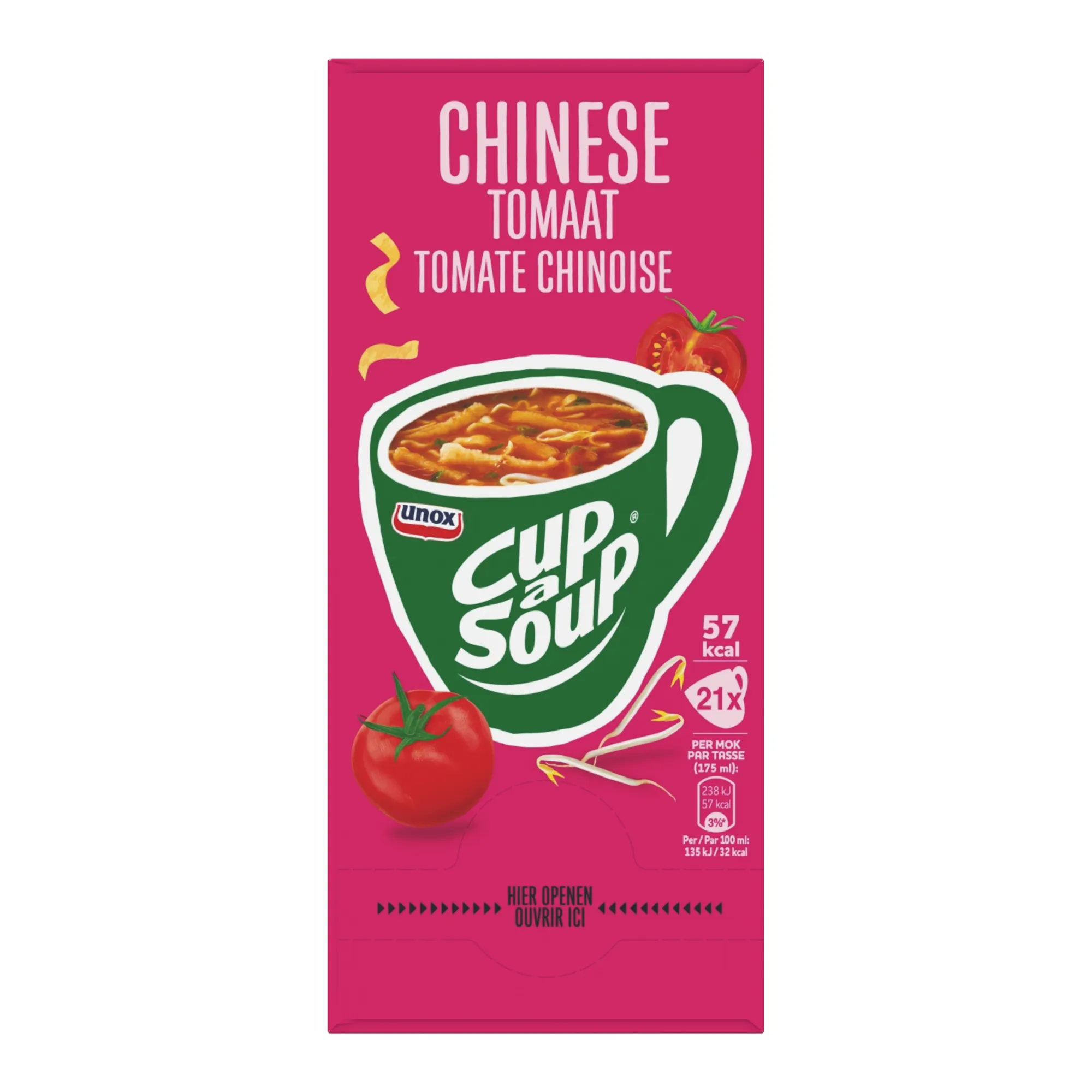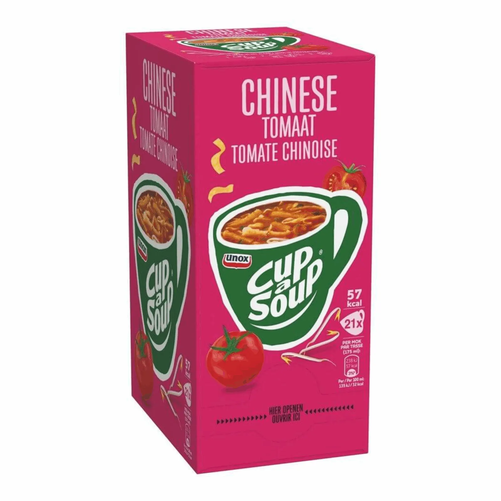 Unox Cup-a-Soup Chinese tomaat is het hele jaar door lekker. Met een intense smaak en gemaakt van duurzaam geteelde tomaten. In de Unox Cup-a-Soup Chinese tomaat variant zitten geen smaakversterkers, kunstmatige kleurstoffen en conserveermiddelen. Deze opkikker geeft jou net dat zetje energie om weer door te gaan met jouw dag. Op Compliment.nl bestel je eenvoudig en voordelig een pak met 24 zakjes Cup-a-Soup Chinese tomaat. Ieder zakje is goed voor een kop van 140 ml. Genieten dus. De Cup-a-Soup Chinese tomaat is ideaal voor zowel bedrijven als particulieren. Schrijf je in voor de nieuwsbrief om nooit meer een Cup-a-Soup aanbieding te missen. Wij verkopen ook de Unox Cup-a-Soup Chinese Tomaat (21x 175ml).
