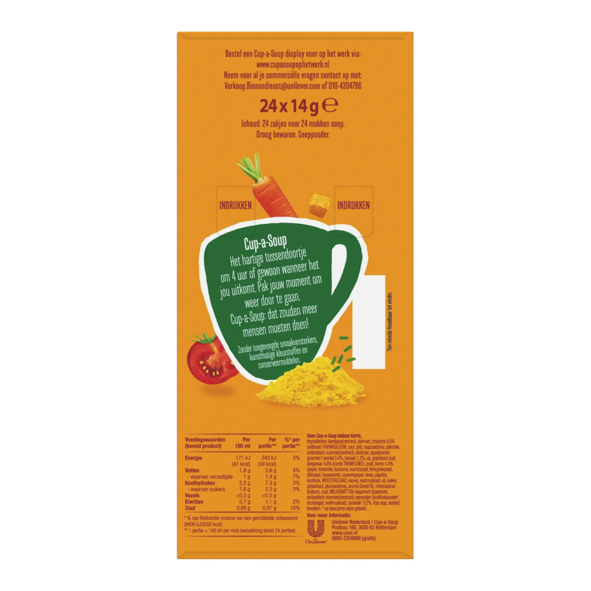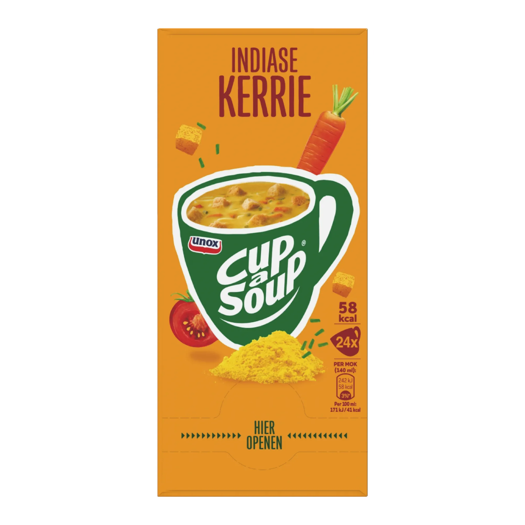 Unox Cup-a-Soup Indiase Kerrie is het hele jaar door lekker. Het is een soep met pittige kruidenmix. In de Unox Cup-a-Soup Indiase Kerrie variant zitten geen smaakversterkers, kunstmatige kleurstoffen en conserveermiddelen. Deze opkikker geeft jou net dat zetje energie om weer door te gaan met jouw dag. Op Compliment.nl bestel je eenvoudig en voordelig een pak met 24 zakjes Cup-a-Soup Indiase Kerrie. Ieder zakje is goed voor een kop van 140 ml. Genieten dus. De Cup-a-Soup Indiase Kerrie is ideaal voor zowel bedrijven als particulieren. Schrijf je in voor de nieuwsbrief om nooit meer een Cup-a-Soup aanbieding te missen. Wij verkopen ook de Unox Cup-a-Soup Indiase Kerrie (21x 175ml).