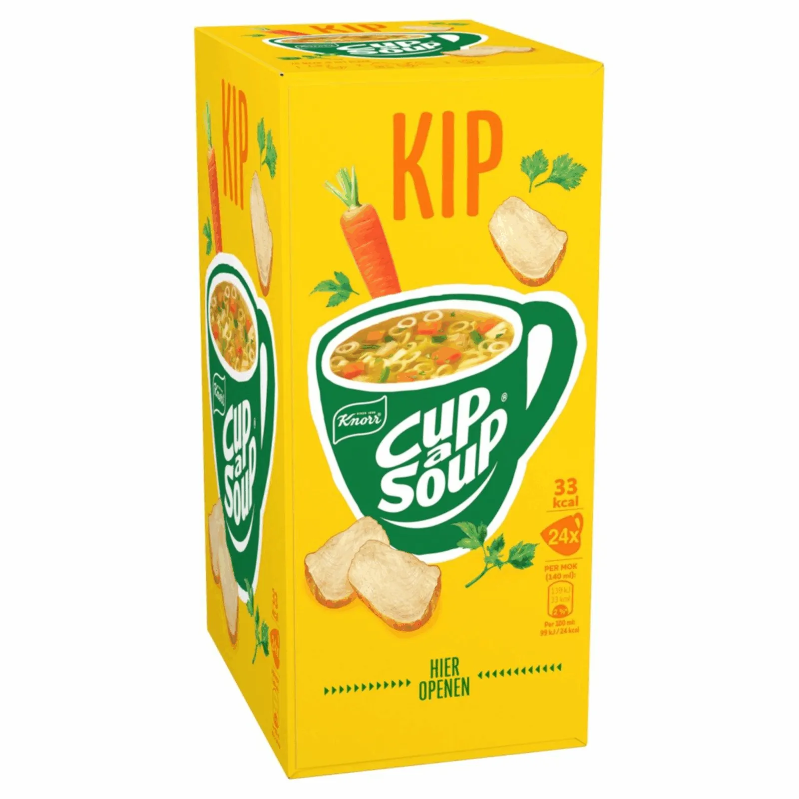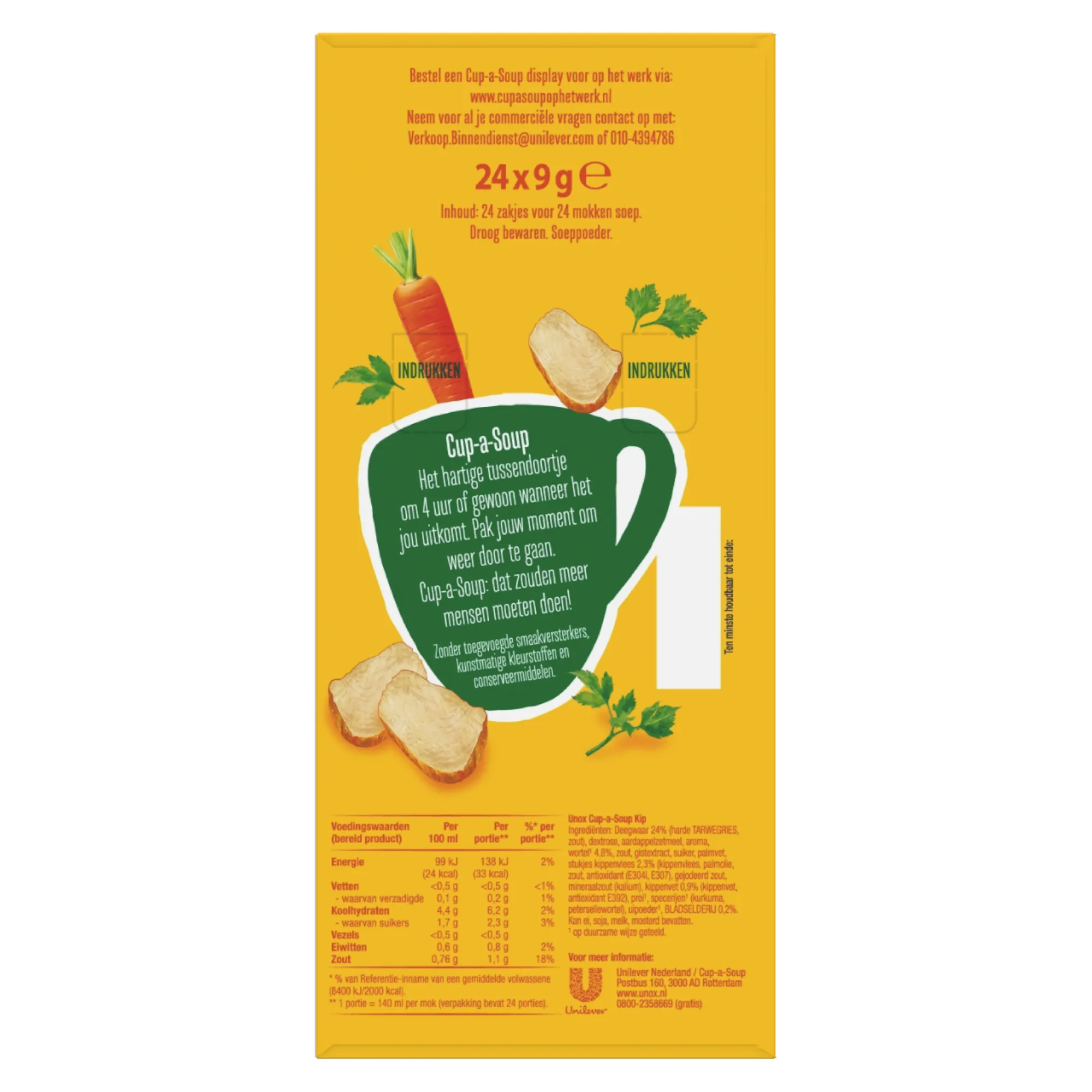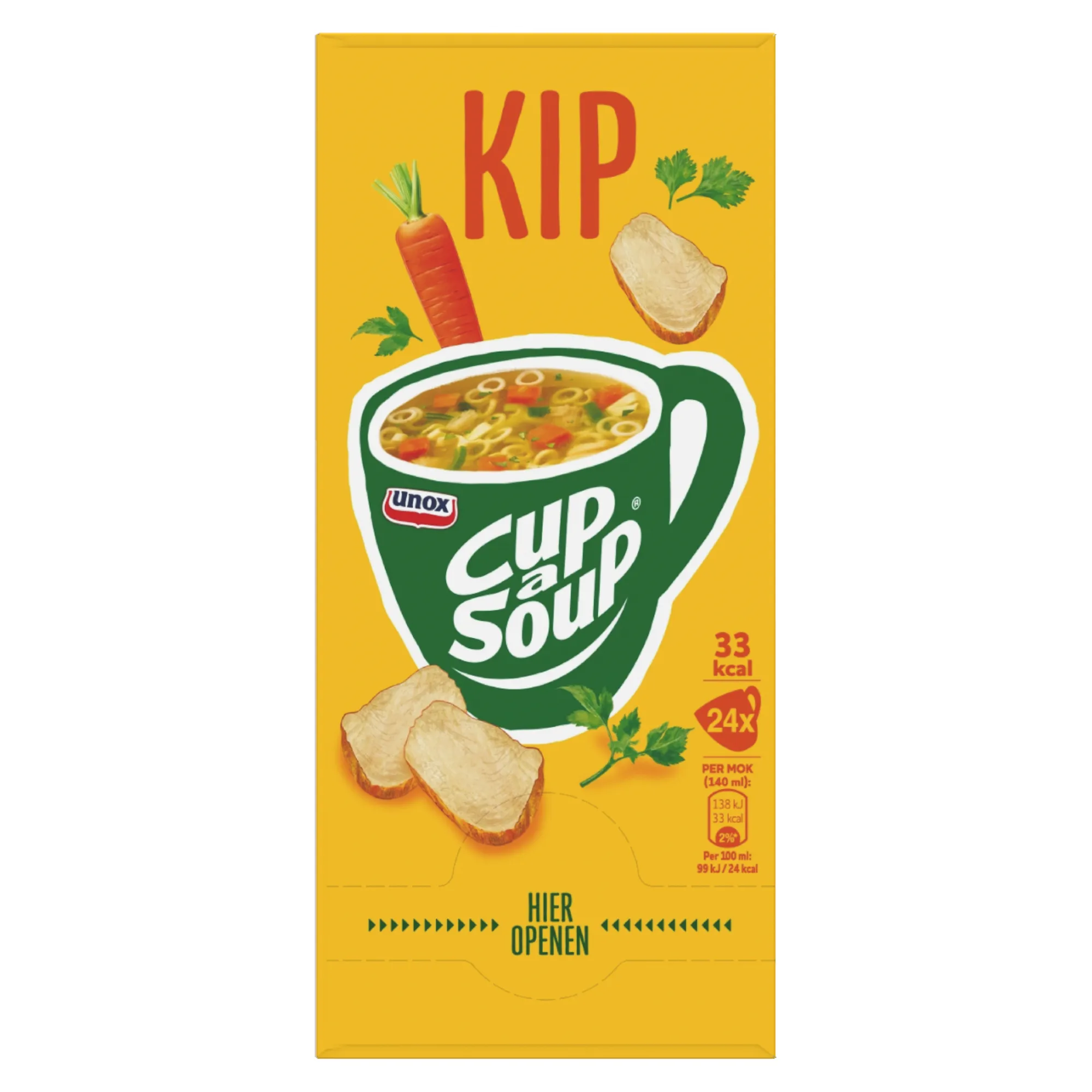 Unox Cup-a-Soup Kip is het hele jaar door lekker. Het is een echte klassieker en erg populair. In de Unox Cup-a-Soup Kip variant zitten geen smaakversterkers, kunstmatige kleurstoffen en conserveermiddelen. Deze opkikker geeft jou net dat zetje energie om weer door te gaan met jouw dag. Op Compliment.nl bestel je eenvoudig en voordelig een pak met 24 zakjes Cup-a-Soup Kip. Ieder zakje is goed voor een kop van 140 ml. Genieten dus. De Cup-a-Soup Kip is ideaal voor zowel bedrijven als particulieren. Schrijf je in voor de nieuwsbrief om nooit meer een Cup-a-Soup aanbieding te missen. Wij verkopen ook de Unox Cup-a-Soup Kip (21x 175ml).