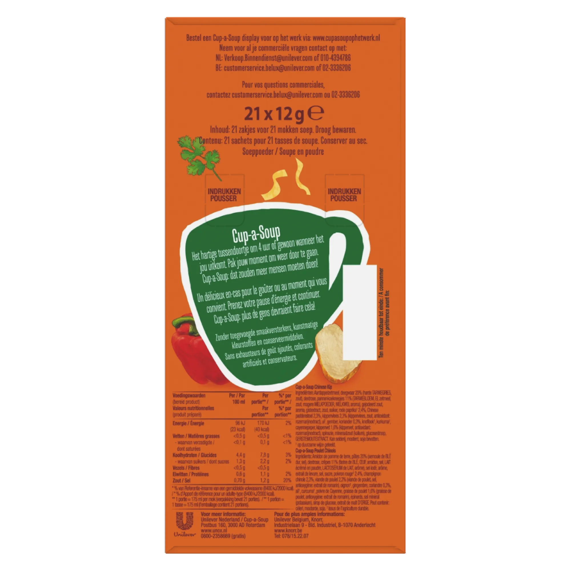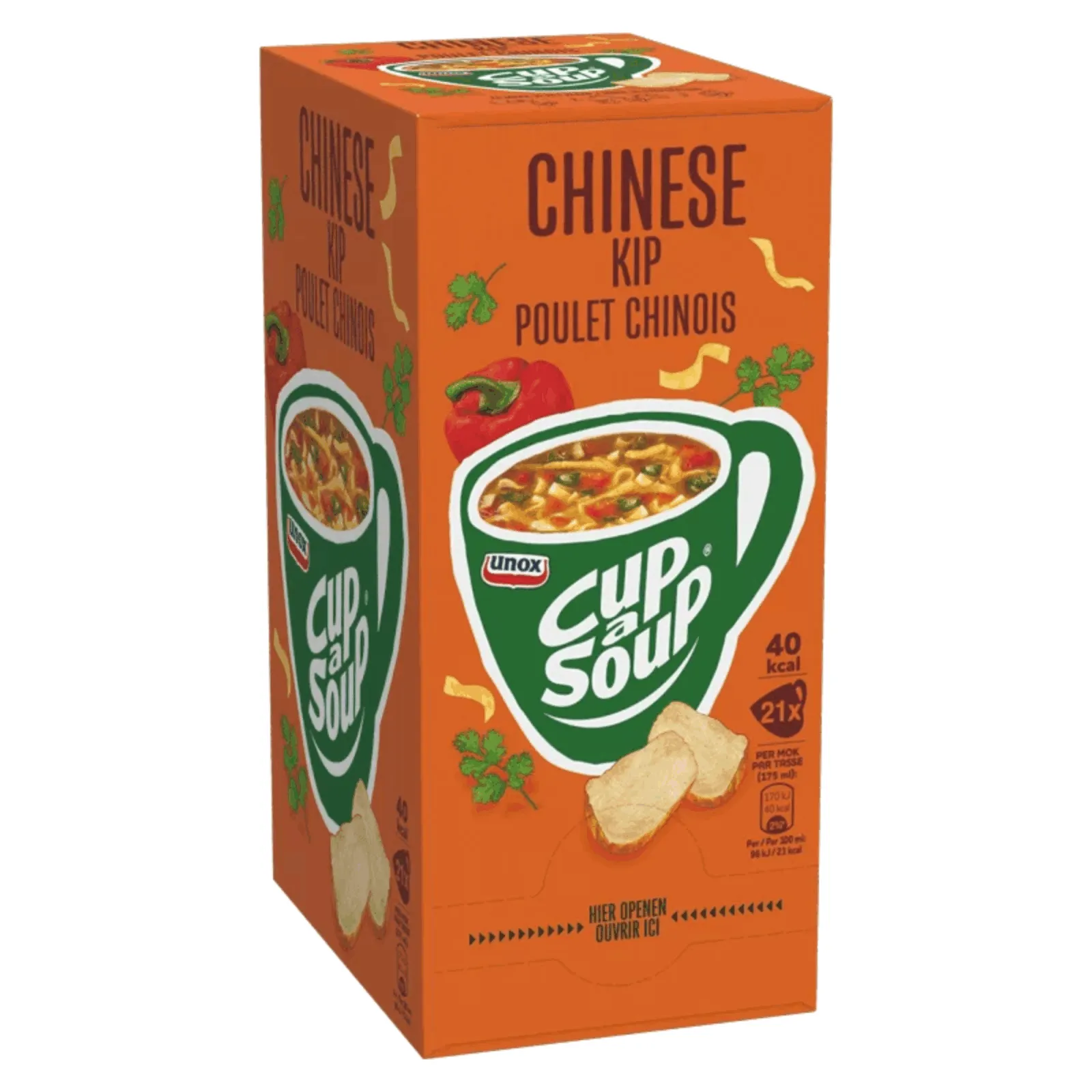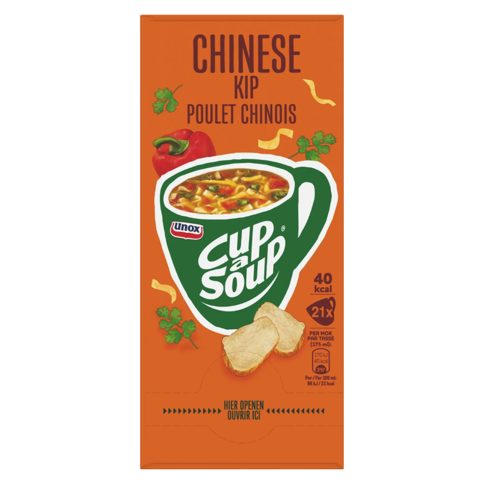 Unox Cup-a-Soup Chinese kip, met een intense kruidige smaak, is het hele jaar door lekker. In de Unox Cup-a-Soup Chinese kip variant zitten geen smaakversterkers, kunstmatige kleurstoffen en conserveermiddelen. Deze opkikker geeft jou net dat zetje energie om weer door te gaan met jouw dag. Op Compliment.nl bestel je eenvoudig en voordelig een pak met 21 zakjes Cup-a-Soup Chinese kip. Ieder zakje is goed voor een kop van 175 ml. Genieten dus. De Cup-a-Soup Chinese kip is ideaal voor zowel bedrijven als particulieren. Schrijf je in voor de nieuwsbrief om nooit meer een Cup-a-Soup aanbieding te missen. Wij verkopen ook de Unox Cup-a-Soup Kip (21x 175ml).