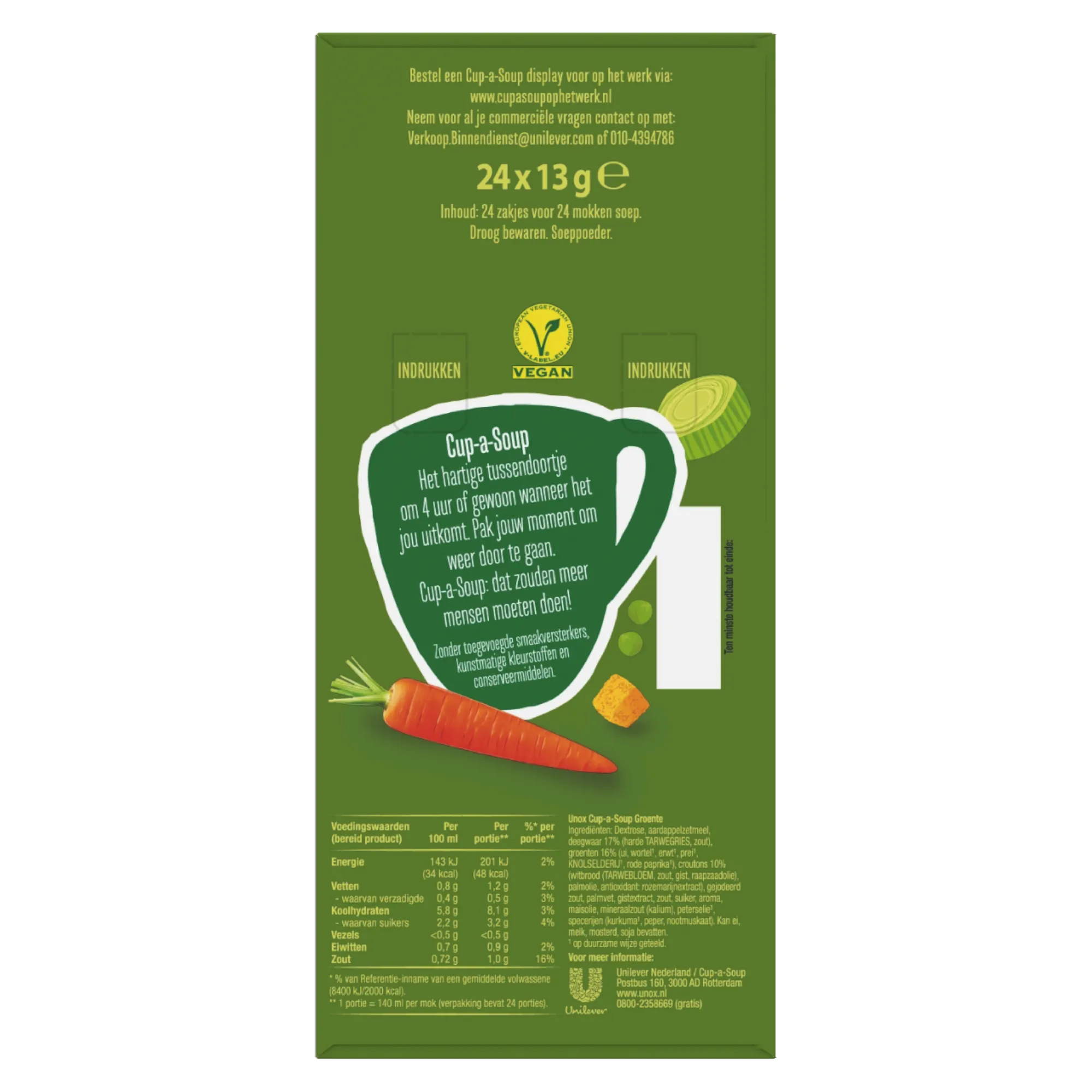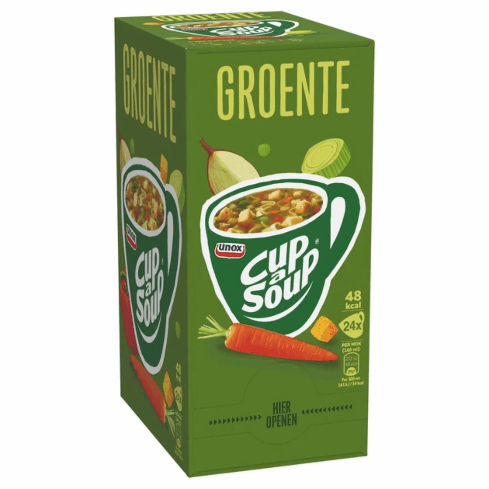 Unox Cup-a-Soup Groente is het hele jaar door lekker. In de Unox Cup-a-Soup Groente variant zitten geen smaakversterkers, kunstmatige kleurstoffen en conserveermiddelen. Deze opkikker geeft jou net dat zetje energie om weer door te gaan met jouw dag. Op Compliment.nl bestel je eenvoudig en voordelig een pak met 24 zakjes Cup-a-Soup Groente. Ieder zakje is goed voor een kop van 140 ml. Genieten dus. De Cup-a-Soup Groente is ideaal voor zowel bedrijven als particulieren. Schrijf je in voor de nieuwsbrief om nooit meer een Cup-a-Soup aanbieding te missen. Wij verkopen ook de Unox Cup-a-Soup Groente (21x 175ml).